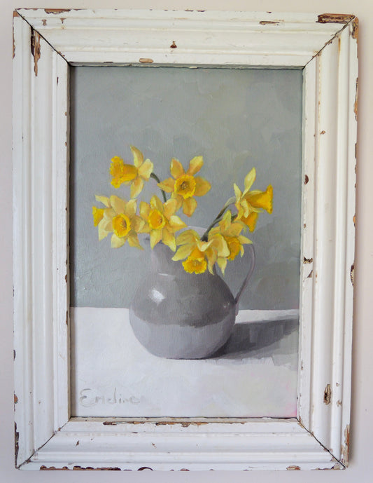 ‘Yellow daffodils in a grey jug’ - Original framed oil painting