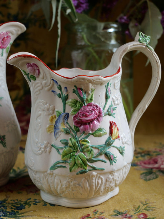 Pair of Antique Staffordshire Floral Relief Jugs