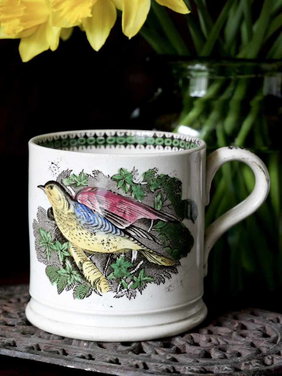 A wonderful 19th century mug with hand coloured bird transfers and a pretty decorative band around the inside rim.