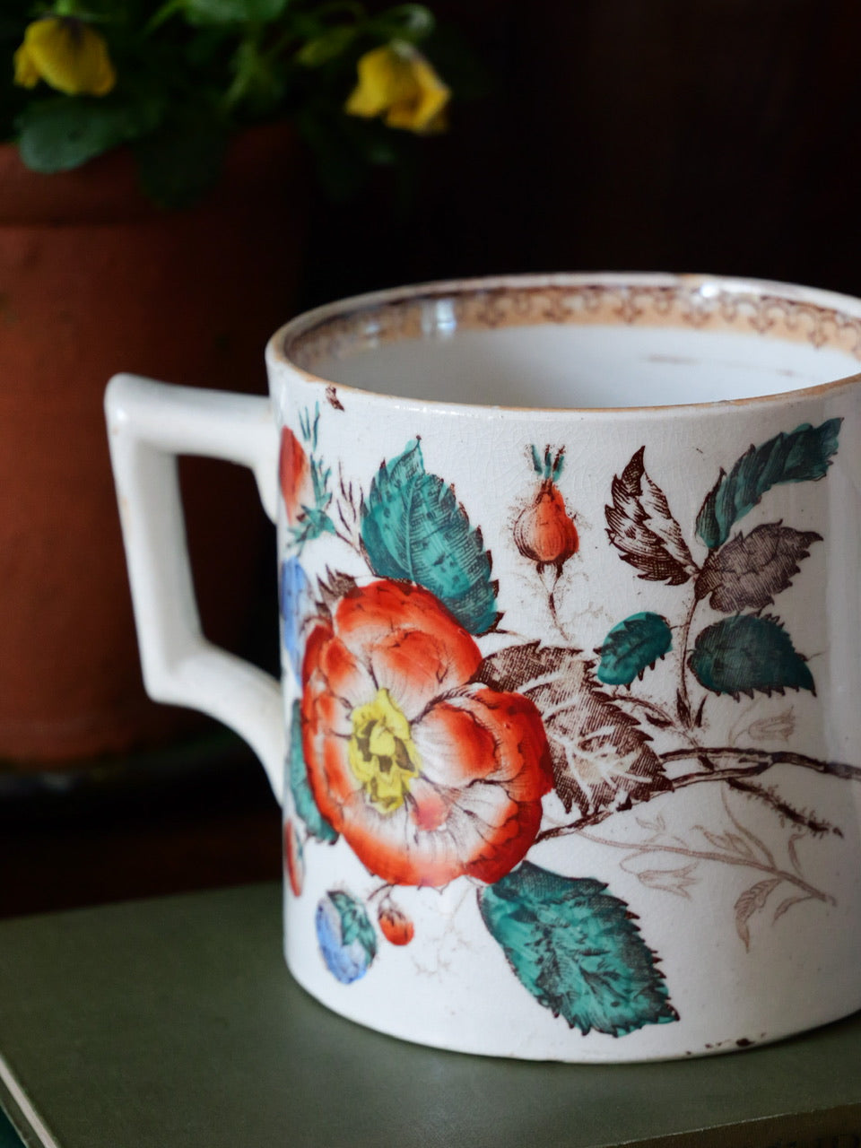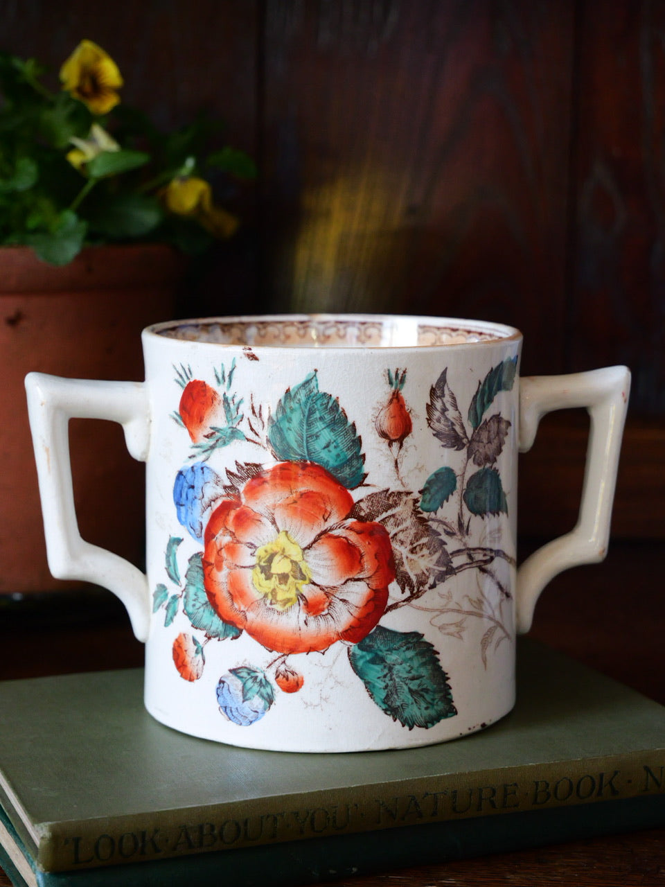 A stunning 19th century large loving cup with floral transfer on both sides which has been beautifully hand coloured in a rich palette. There is also a pretty decorative band inside the rim of the mug which has been finished with an attractive apricot lustre.