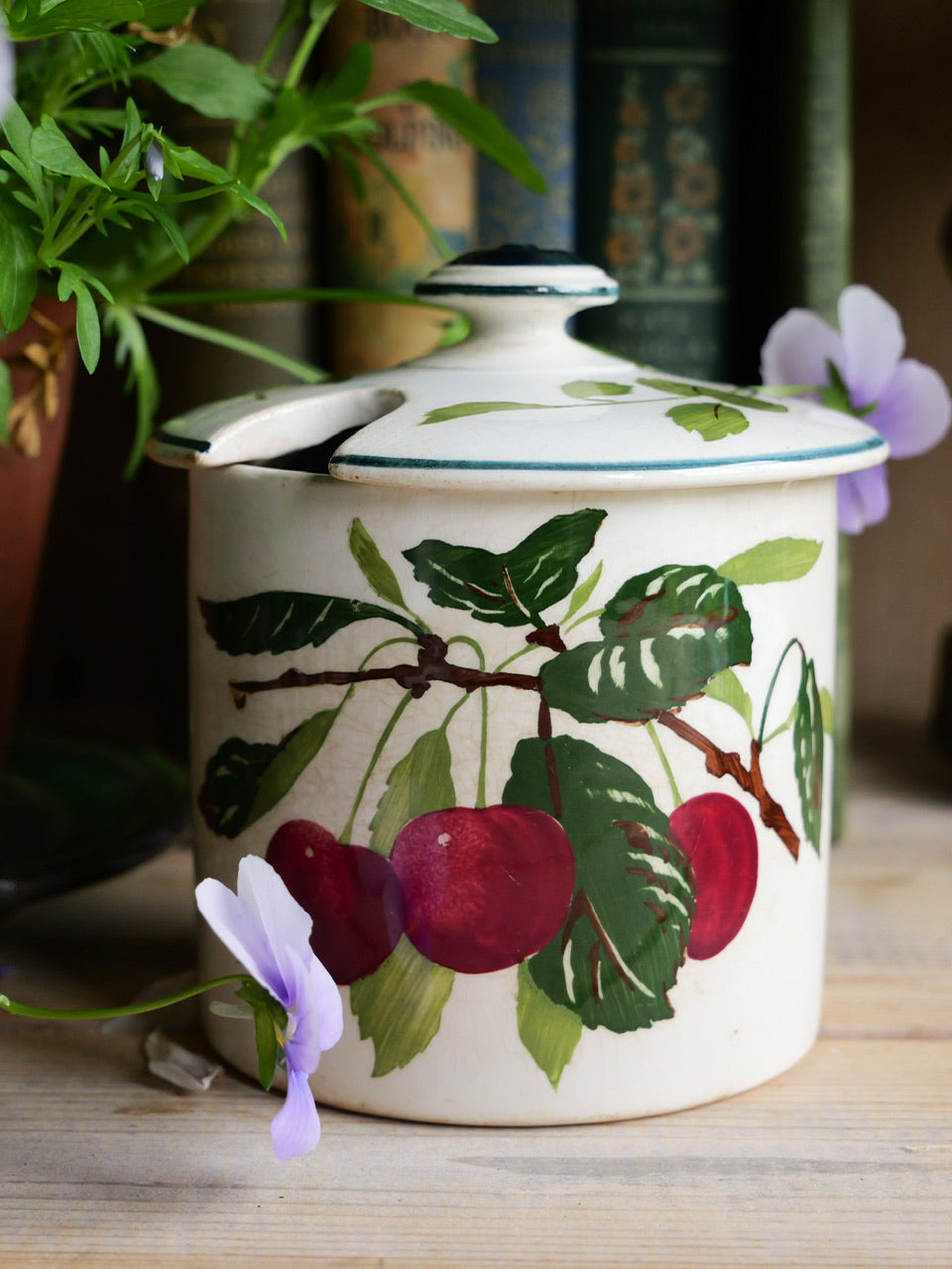 An antique jam pot by Villeroy & Boch with beautiful hand painted cherry decoration.