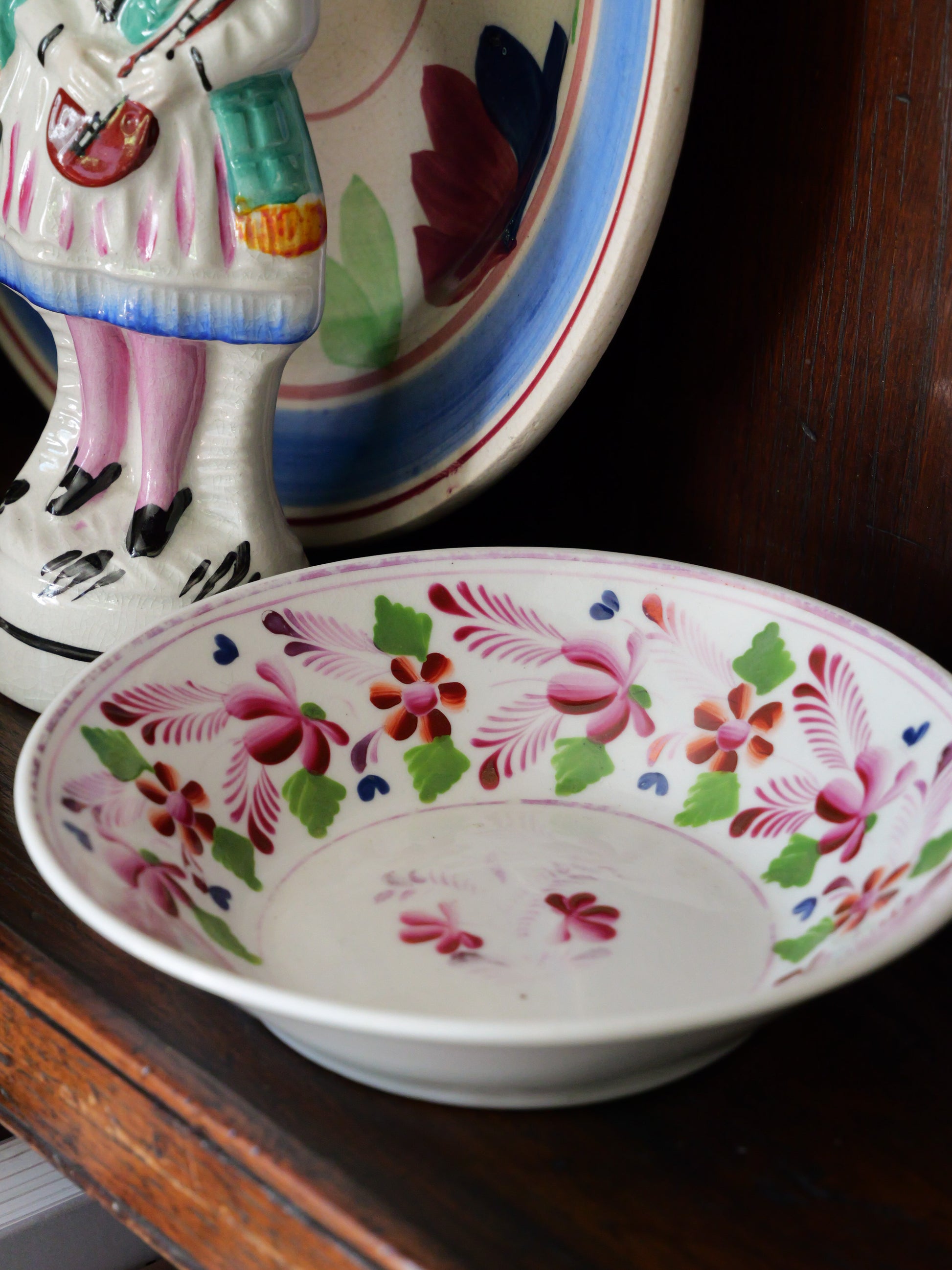 Very pretty little hand painted antique saucer in pinks and greens. Pink lustre detail to edge.