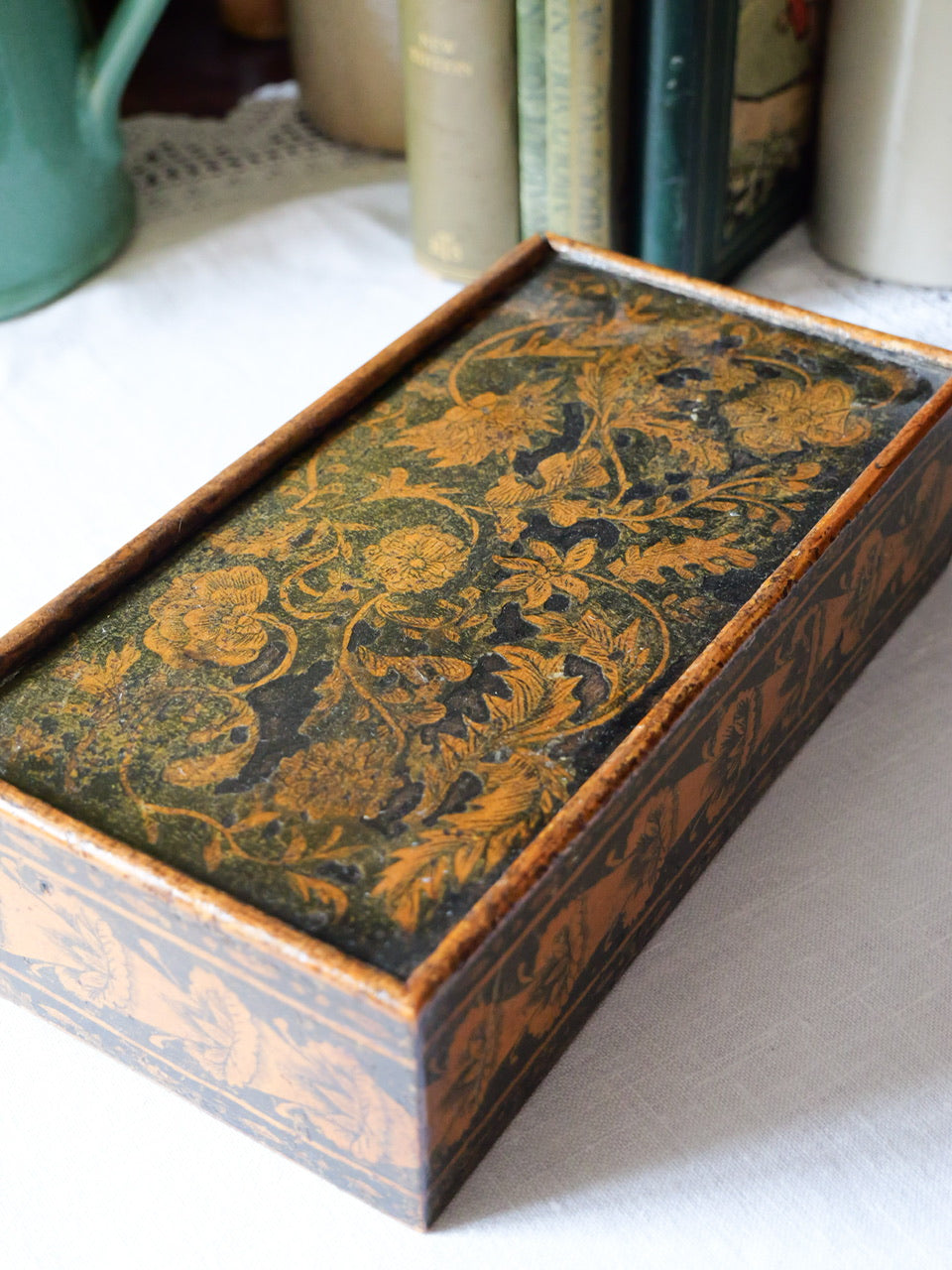 Penwork was a very fashionable decoration during the regency period where black lacquer was painted onto light timber before being scratched off with a fine pen.