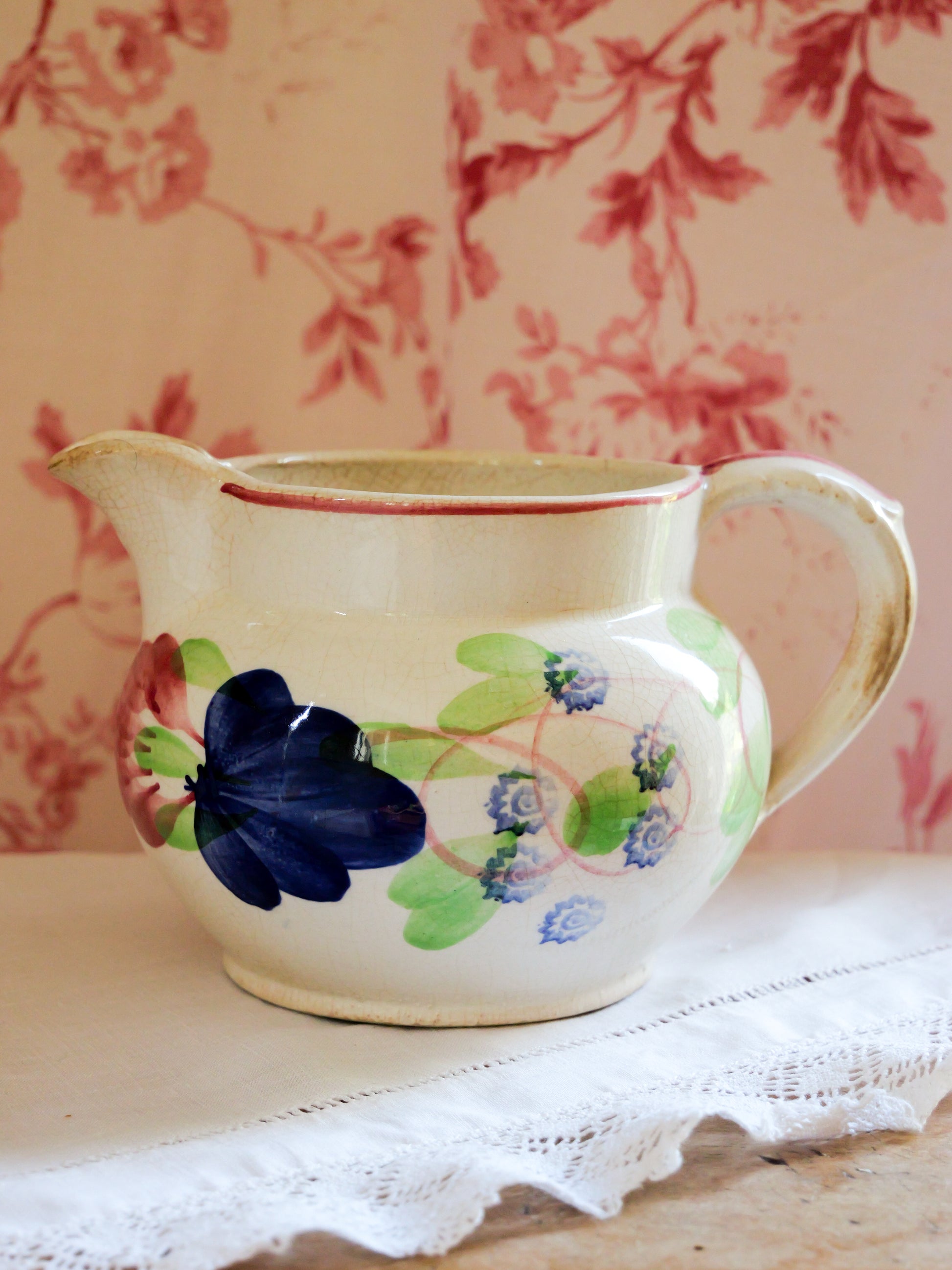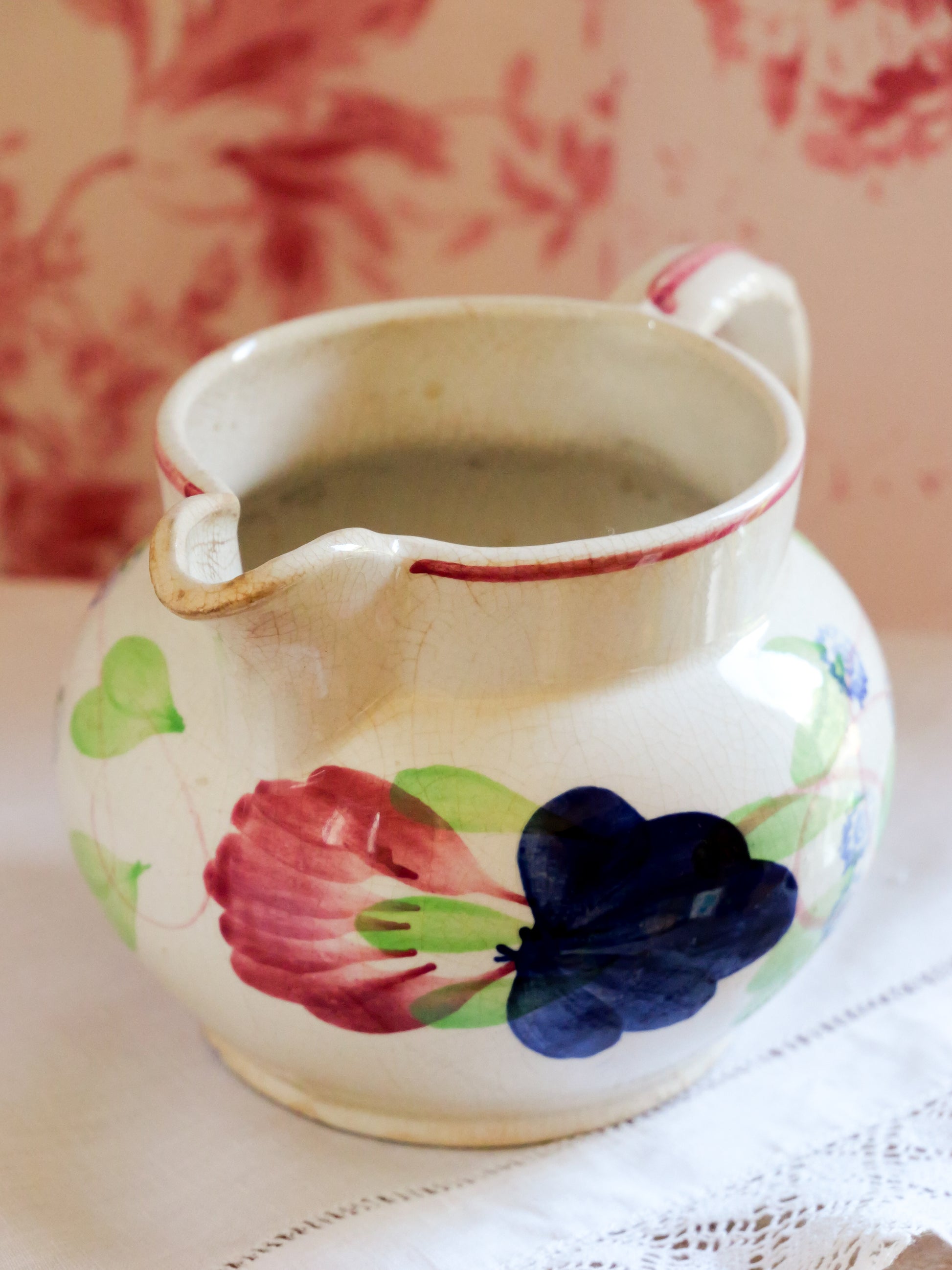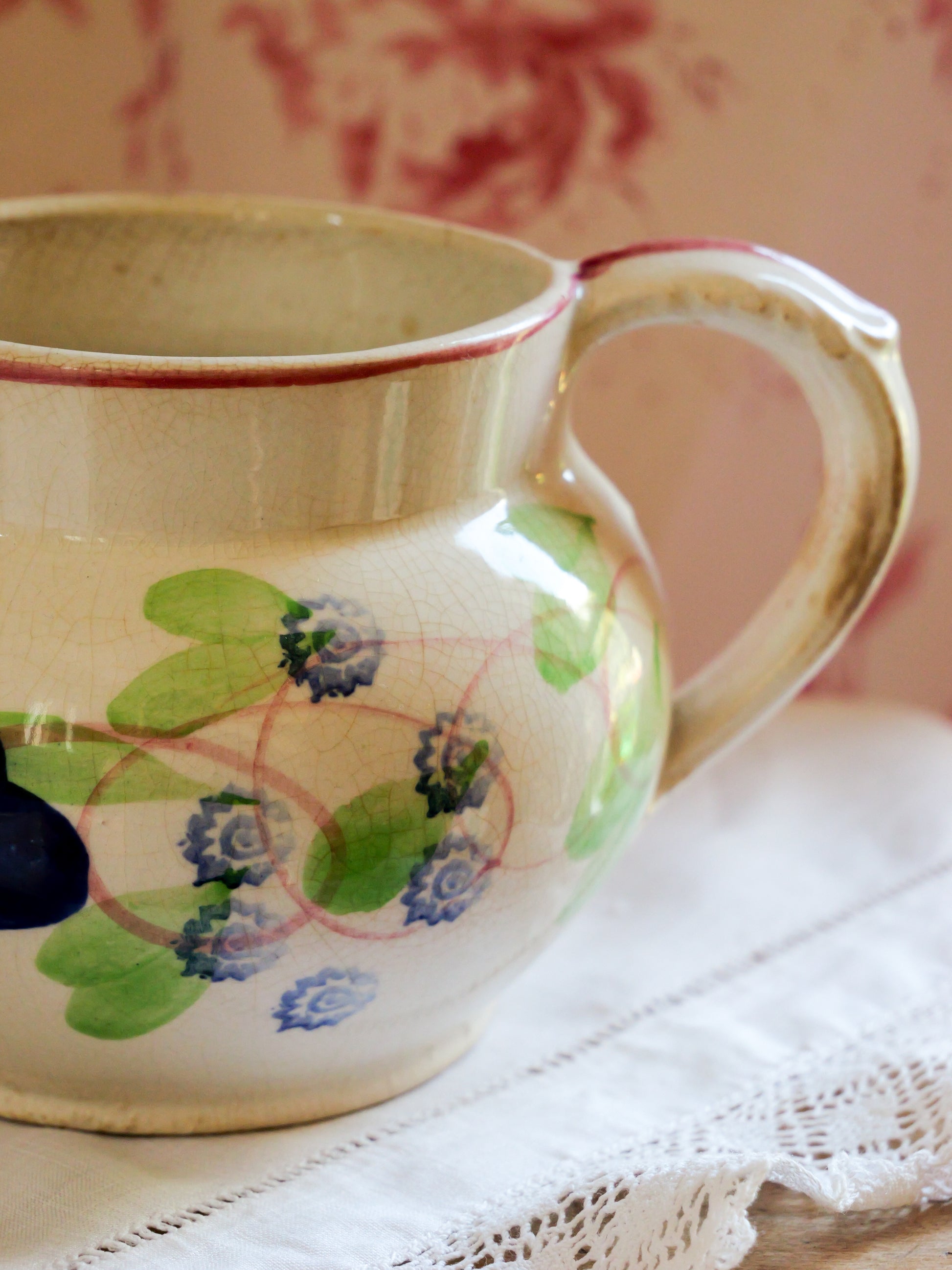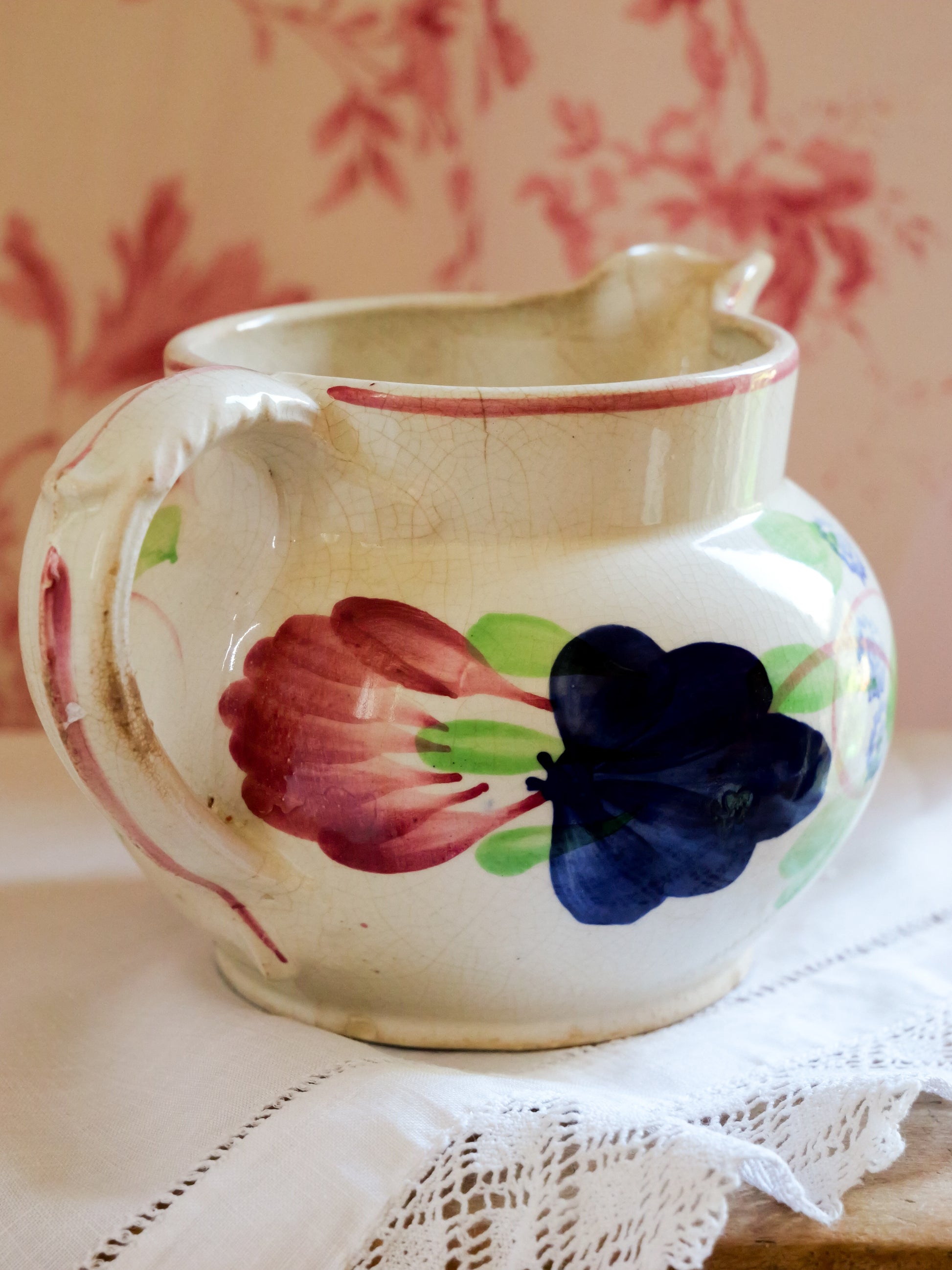 A very pretty rounded antique earthenware jug, decorated beautifully in a classic sponged tulip pattern.