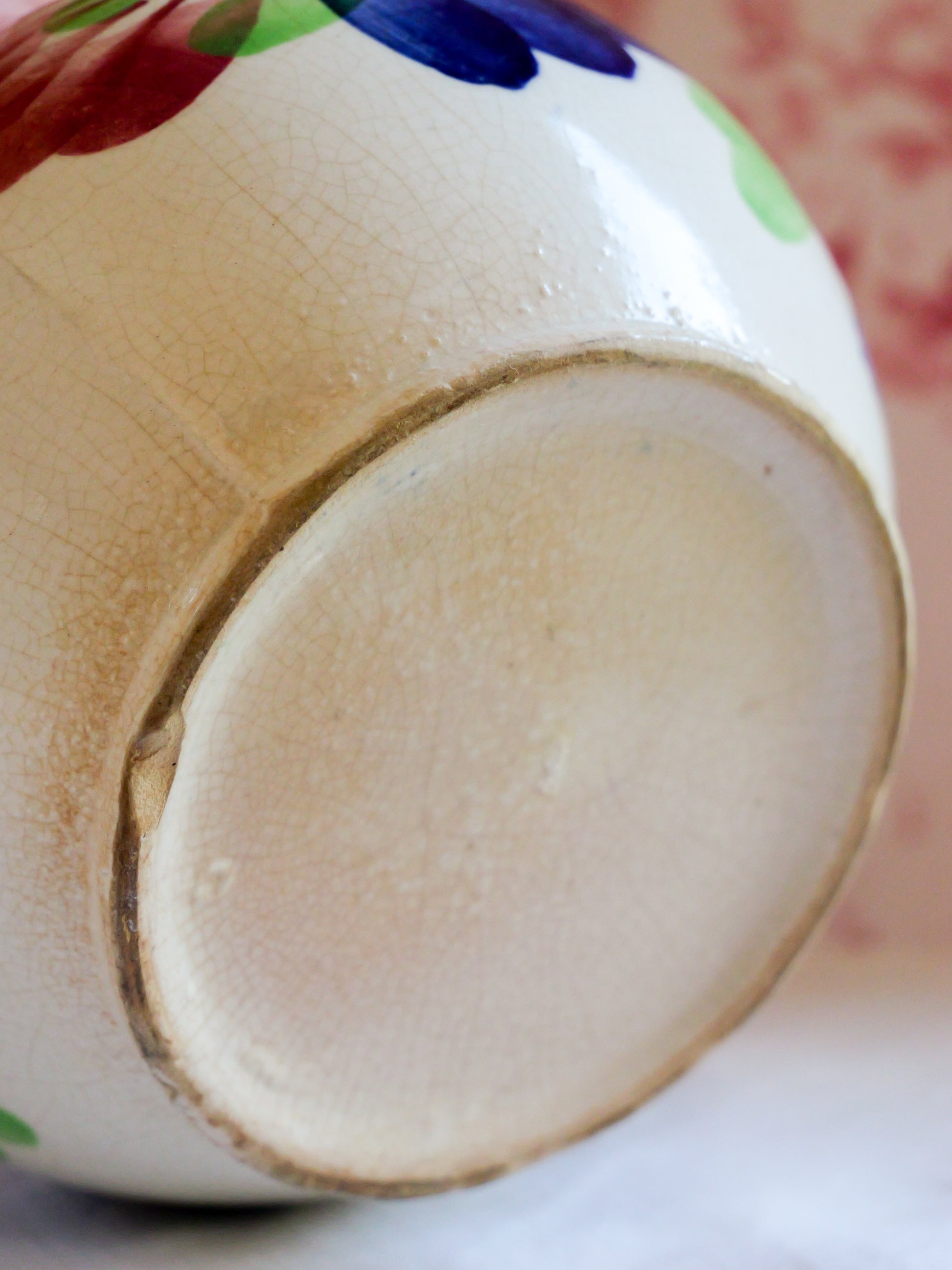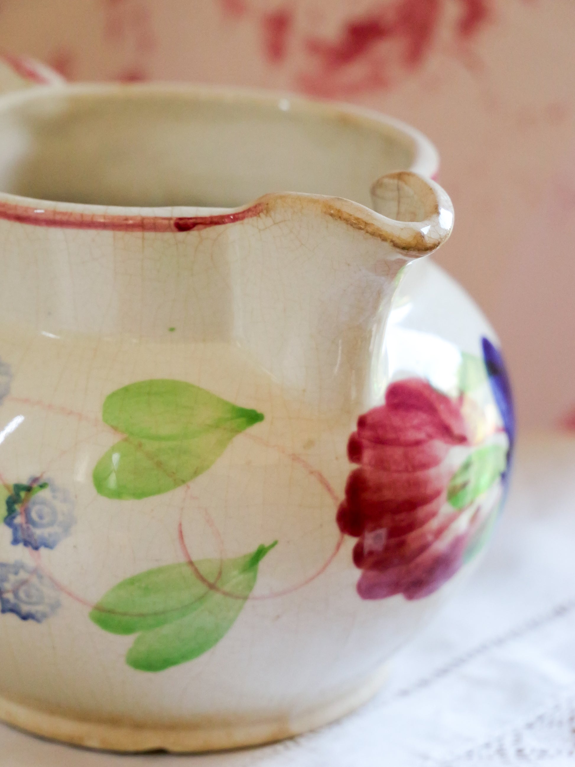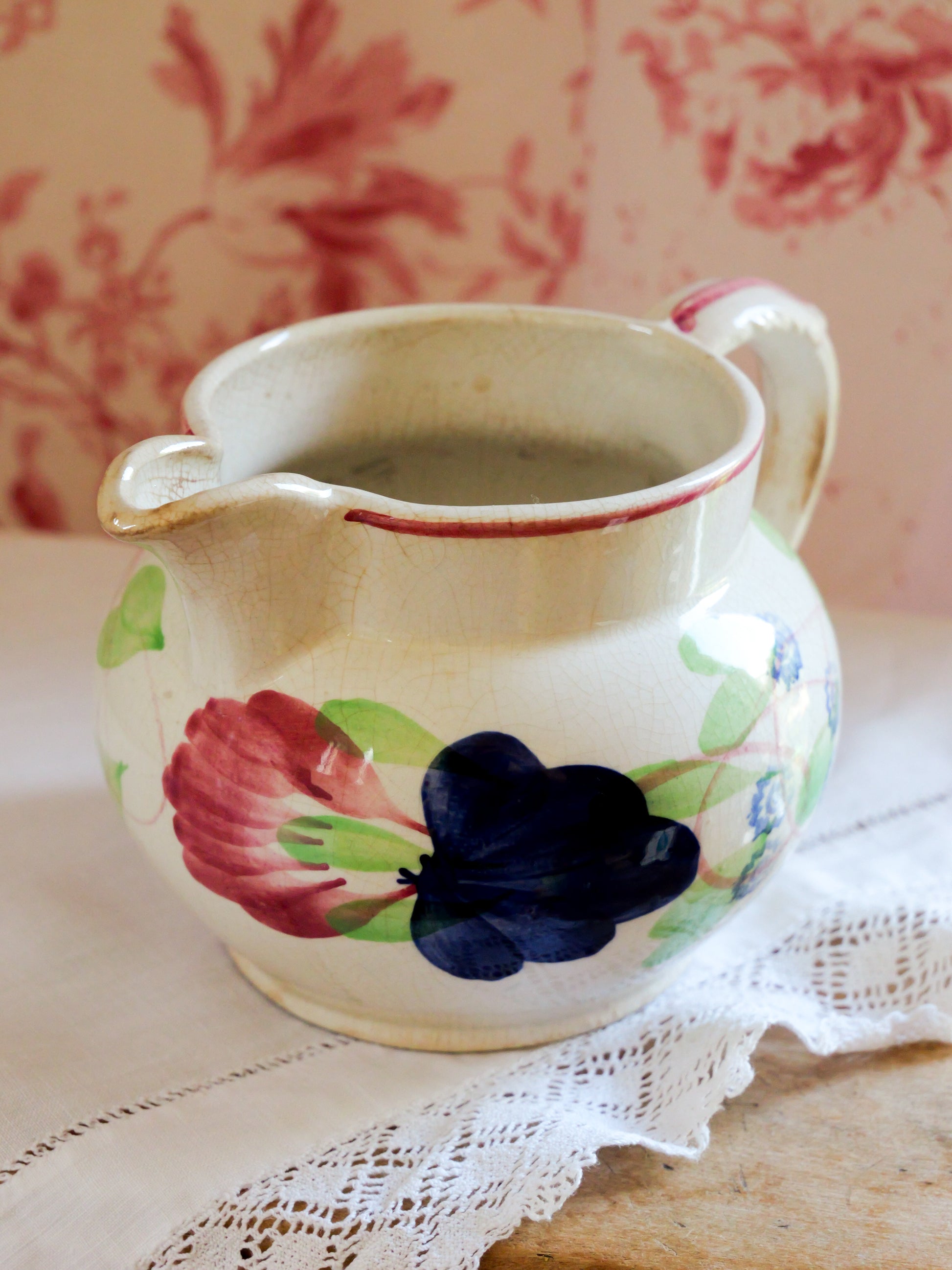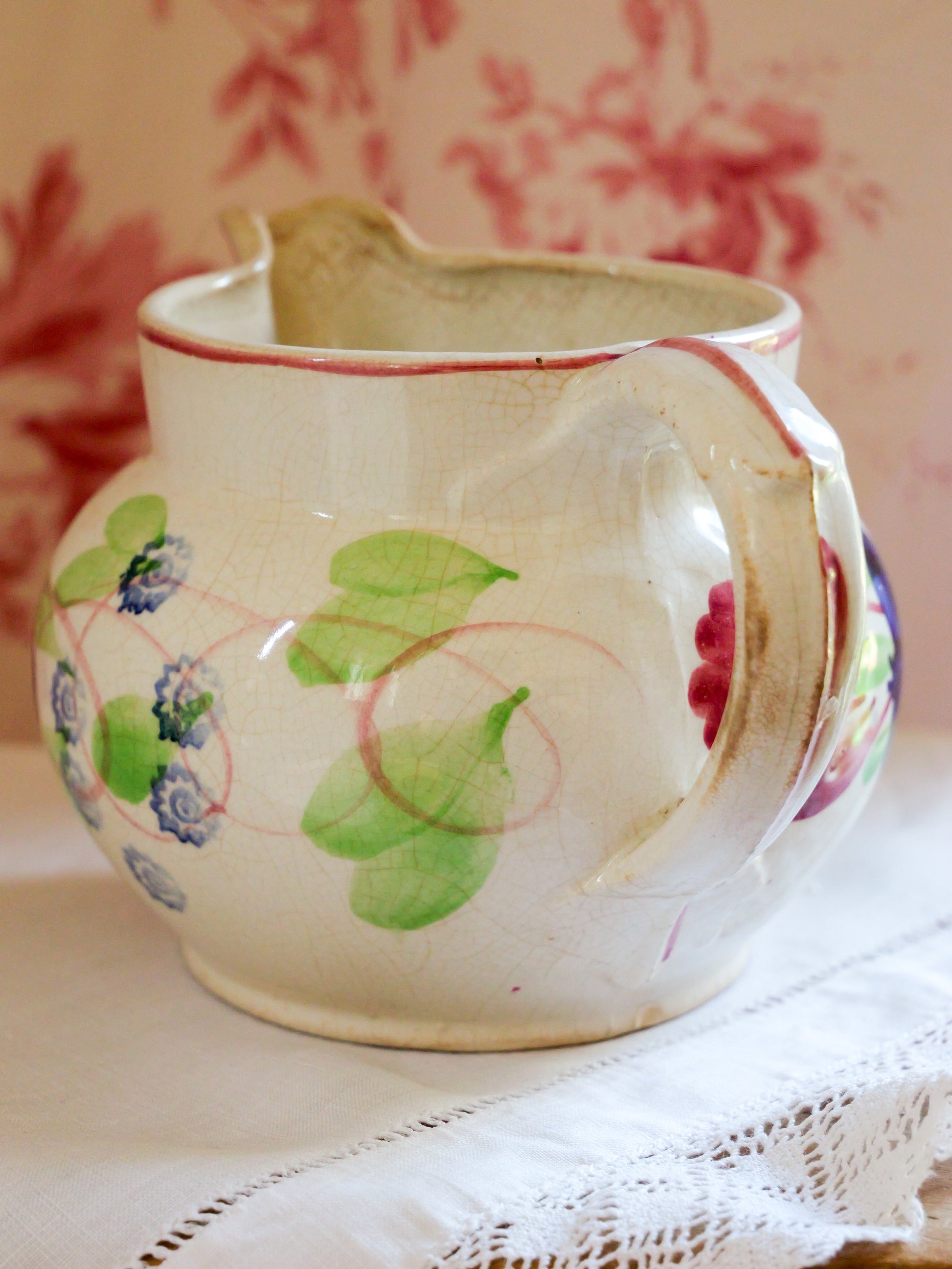 A very pretty rounded antique earthenware jug, decorated beautifully in a classic sponged tulip pattern.