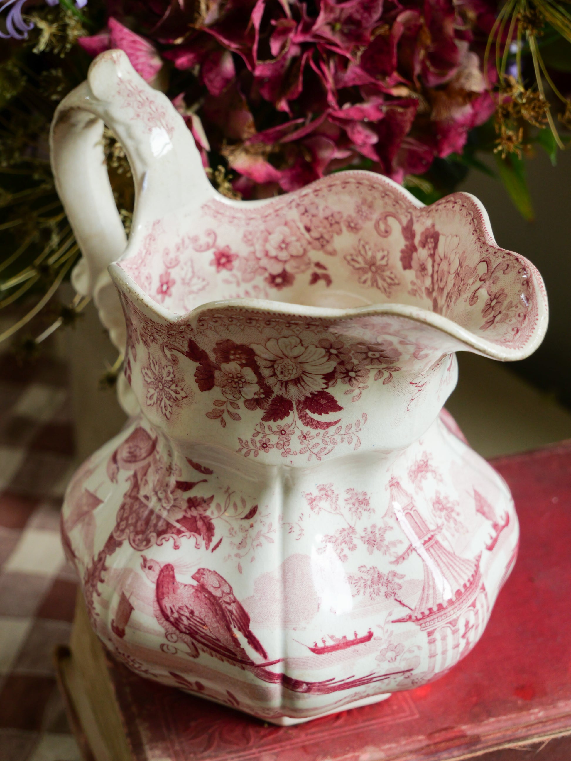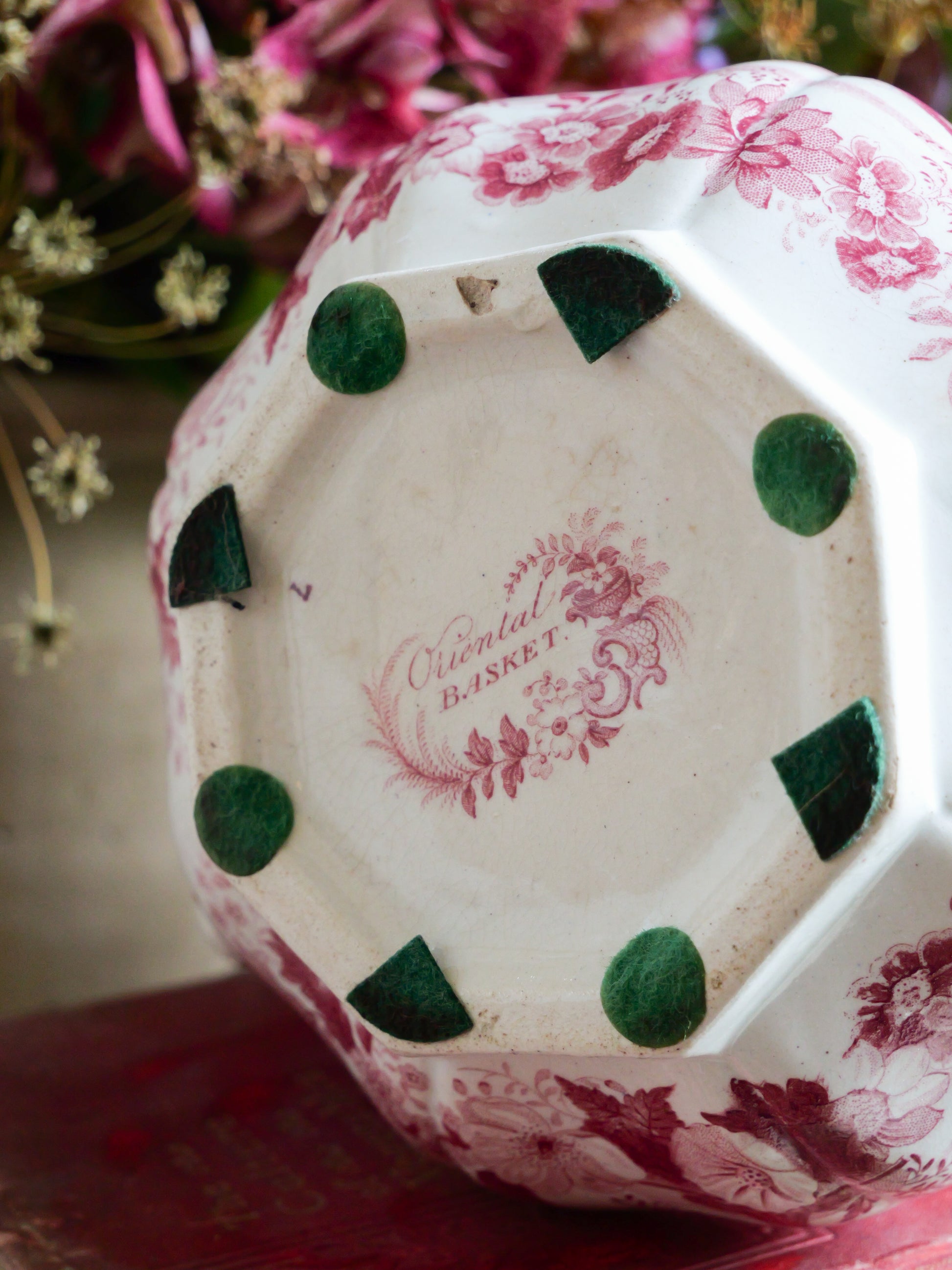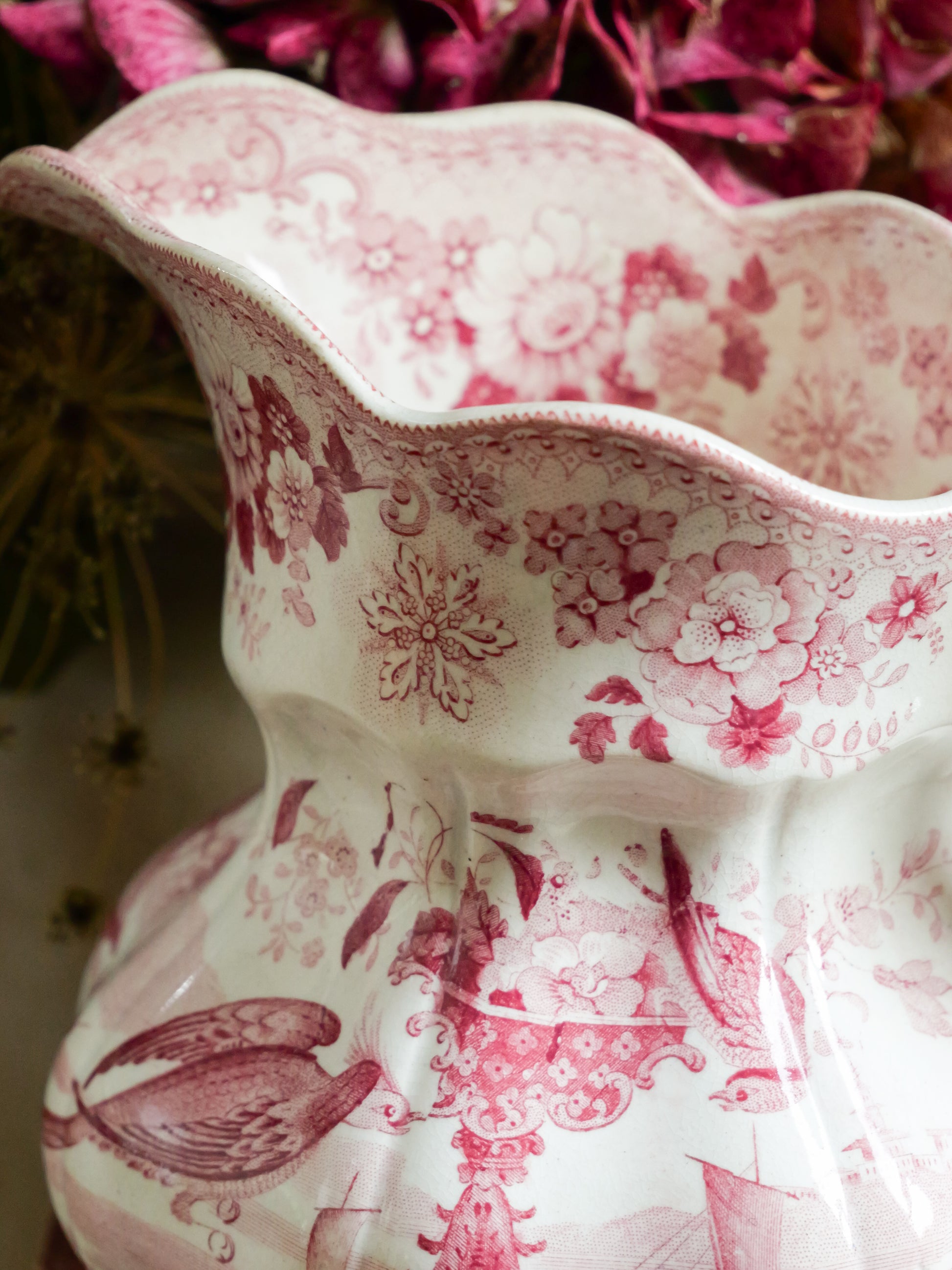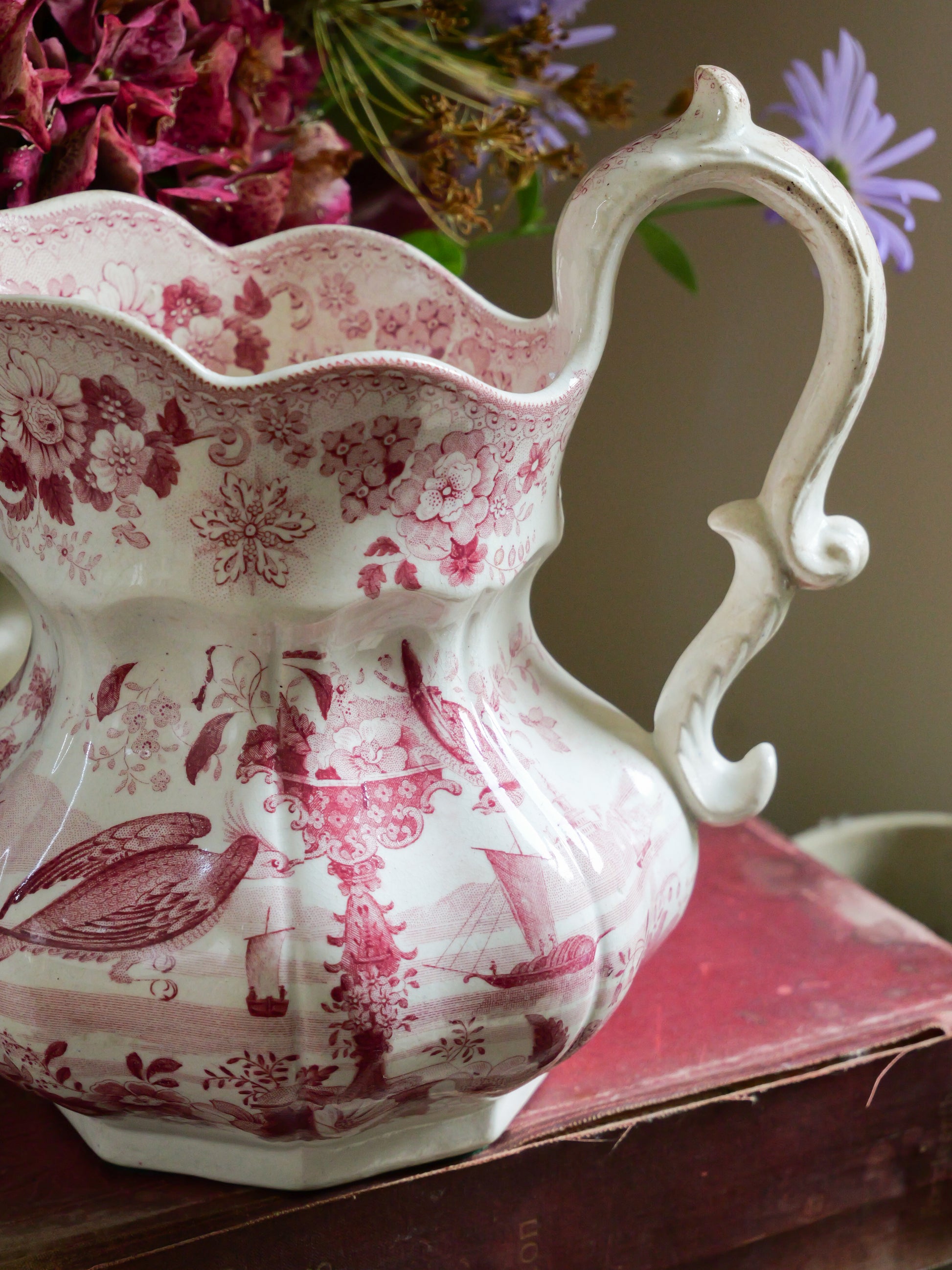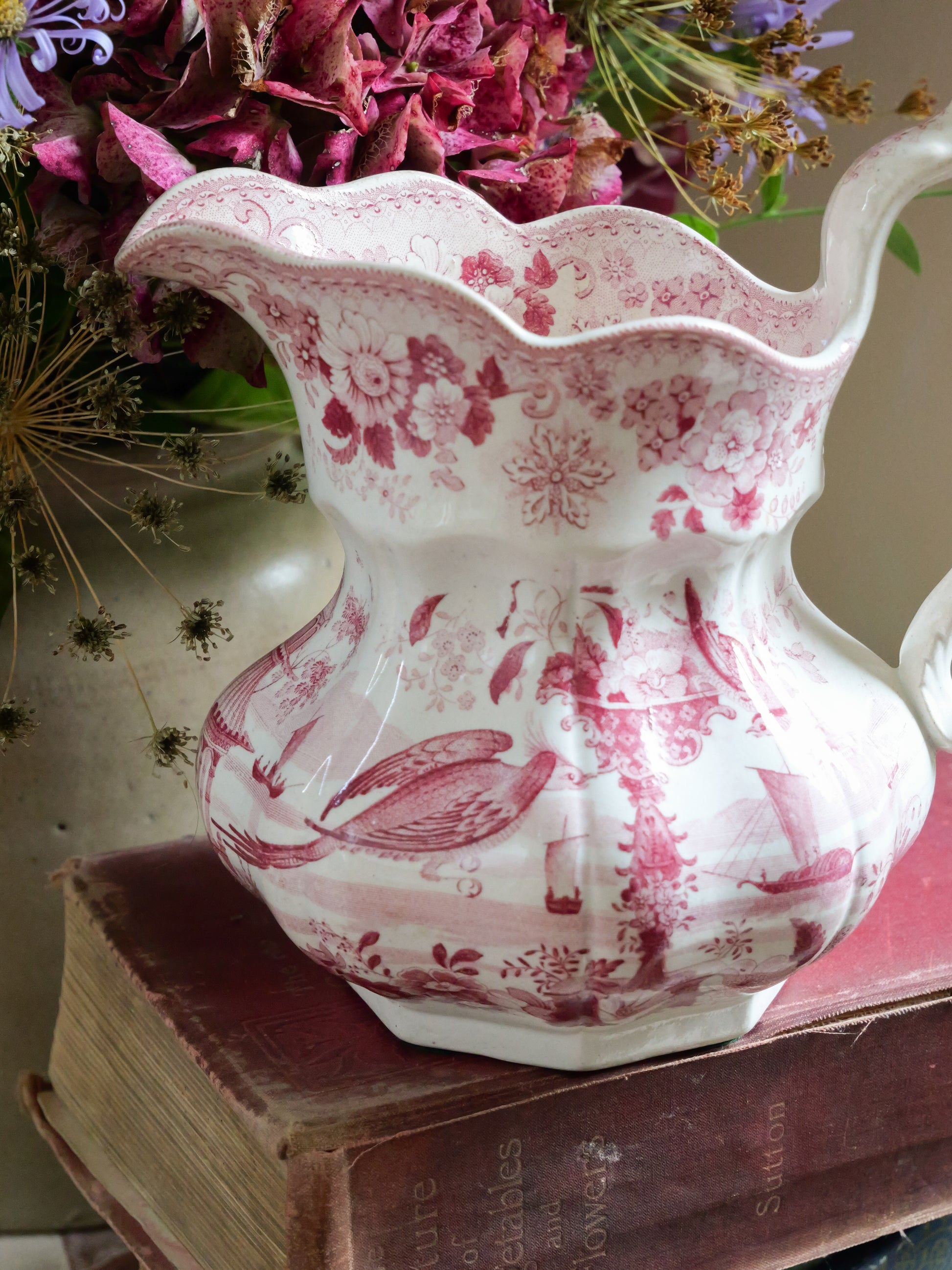 This exquisite Swansea pouch jug, dating to circa 1820 is decorated with an intricate all-over pink transfer design featuring birds, flowers, and serene oriental river scenes. The pattern, known as ‘Oriental Basket,’ exemplifies the delicate artistry of Swansea pottery from this period.