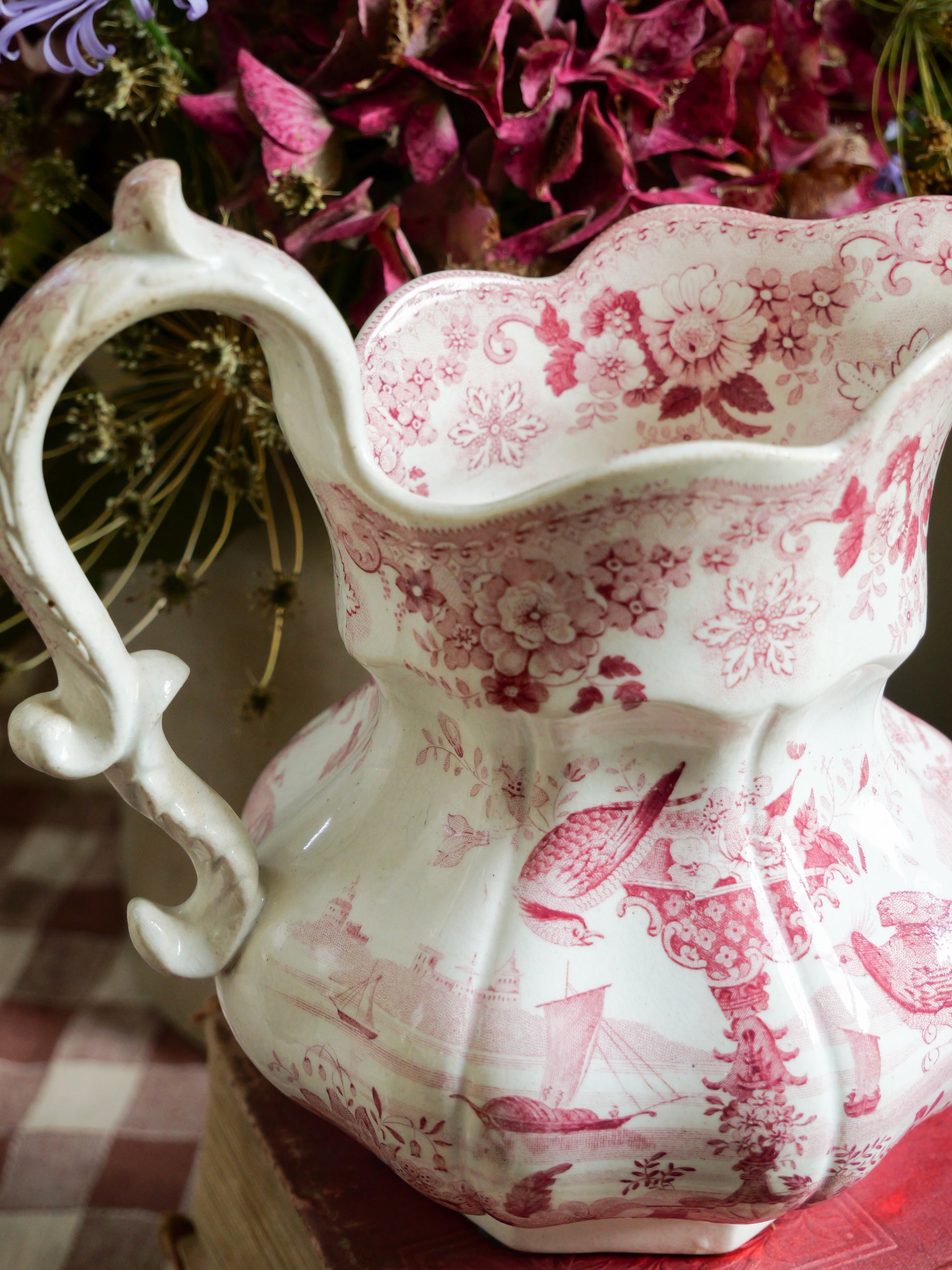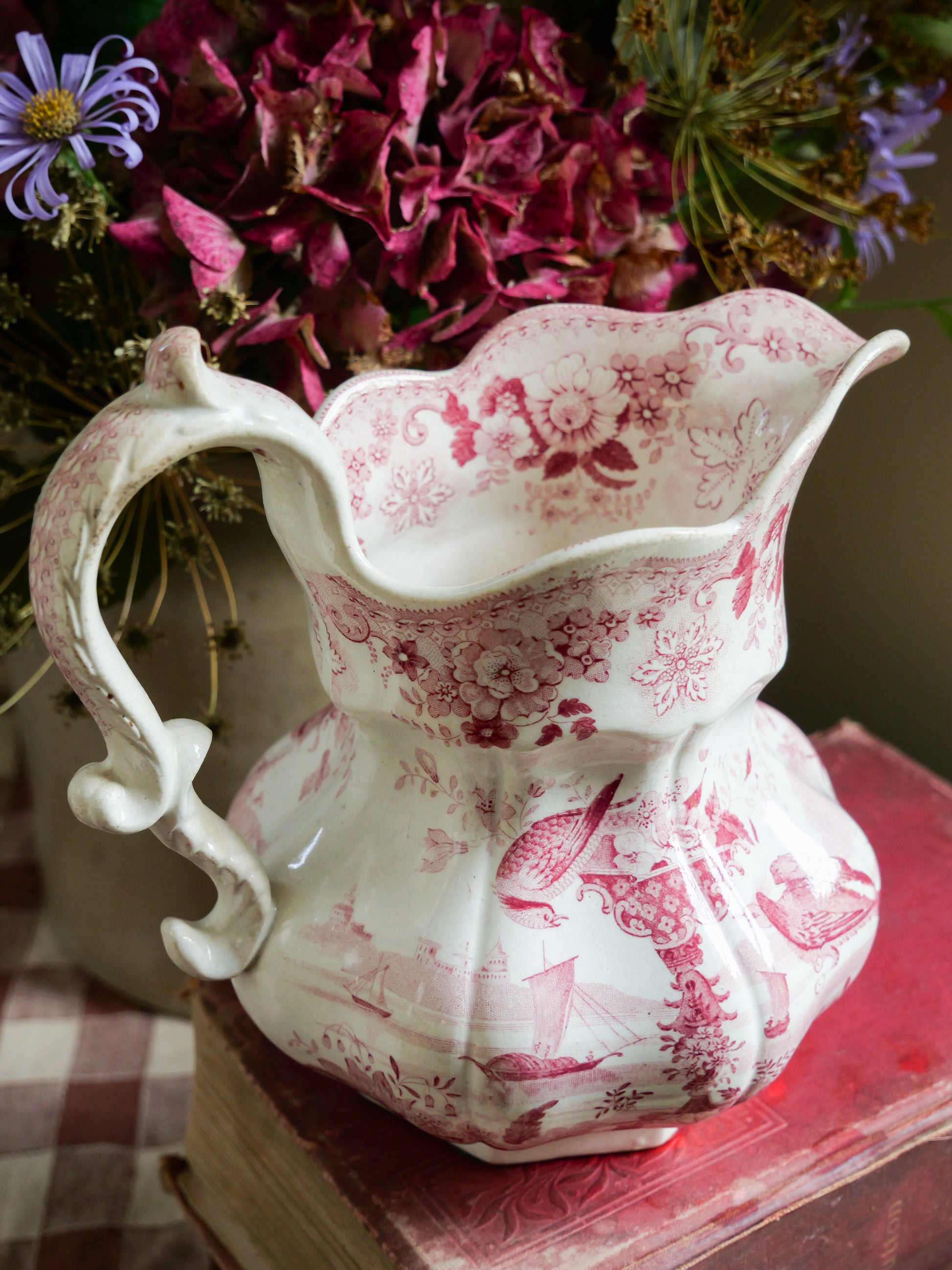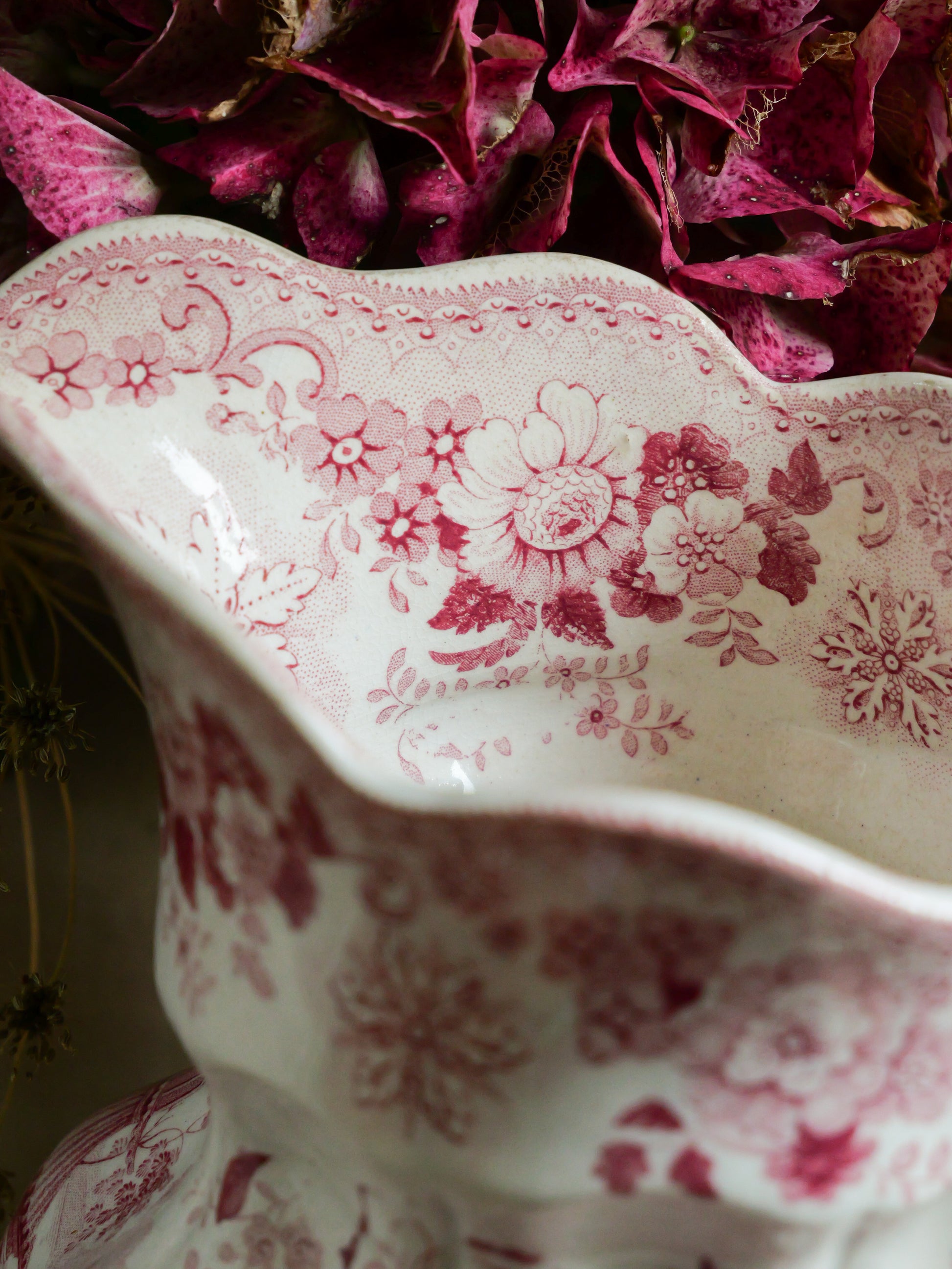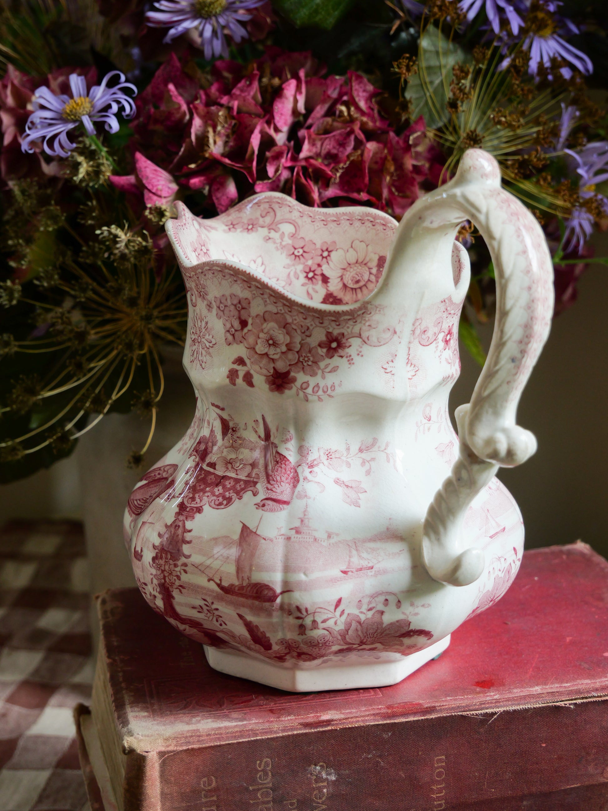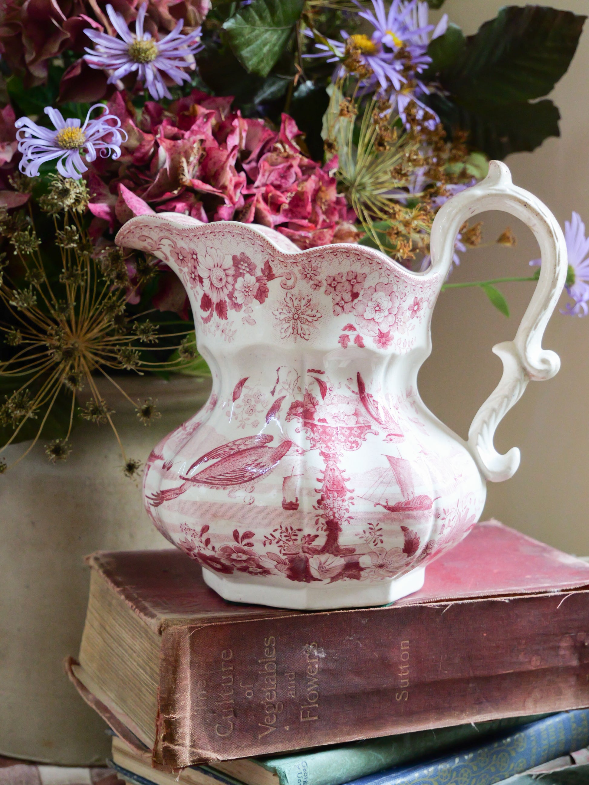 This exquisite Swansea pouch jug, dating to circa 1820 is decorated with an intricate all-over pink transfer design featuring birds, flowers, and serene oriental river scenes. The pattern, known as ‘Oriental Basket,’ exemplifies the delicate artistry of Swansea pottery from this period.