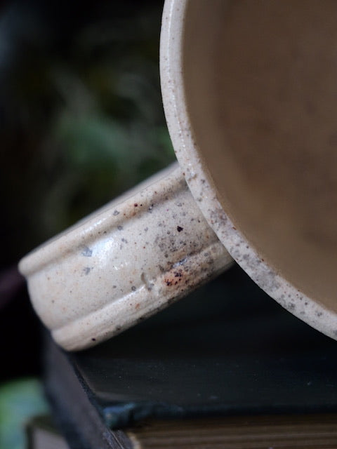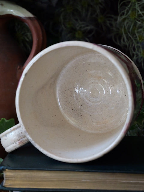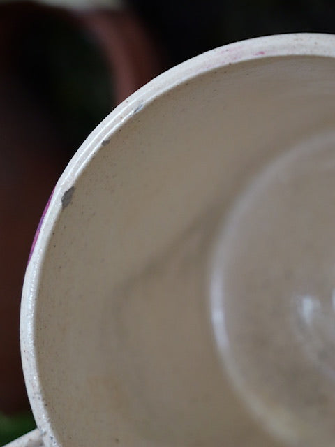Good antique condition. Some very small chips to the rim, light firing marks to handle and a small manufacturing flaw to the base. Please see photos for exact condition.