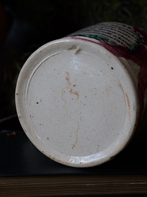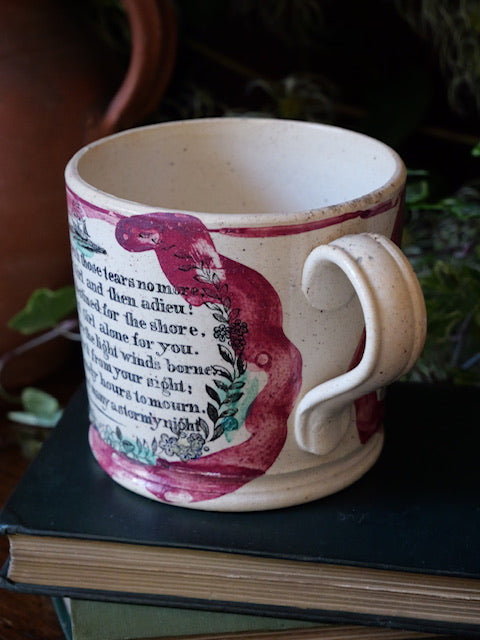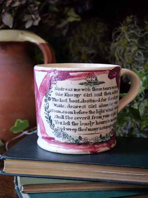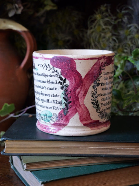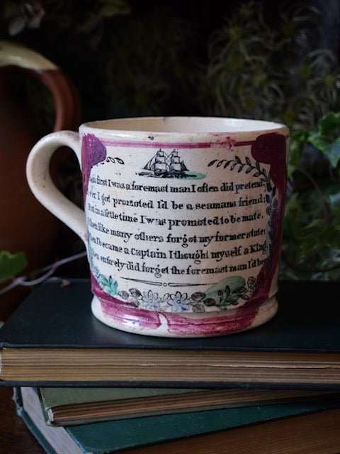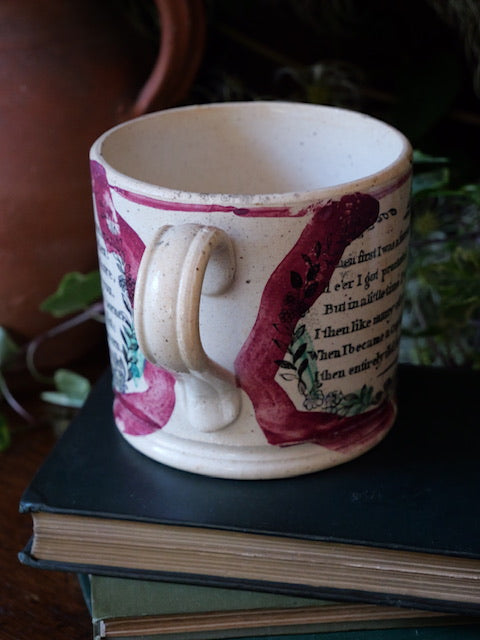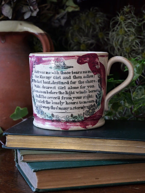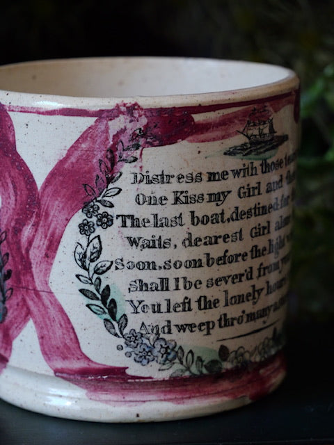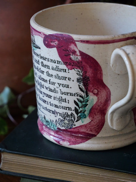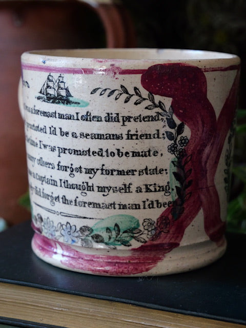 A very rare early 19th century Sunderland lustre mug with a two verse sailor’s poem transfer surrounded by floral decoration which has been roughly hand coloured in the signature manner in pale blue, green and deep pink.