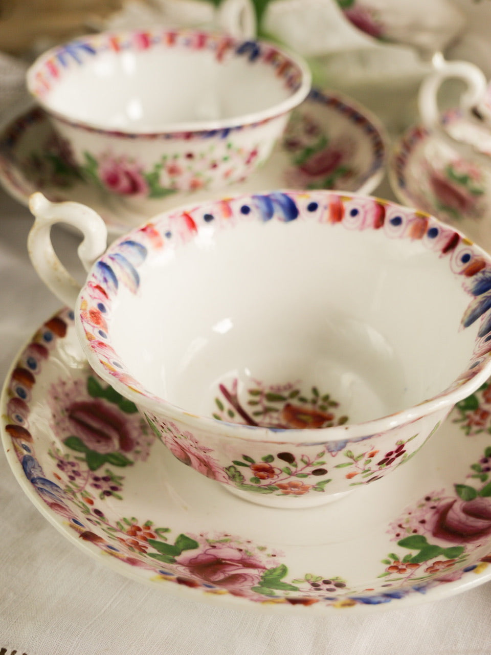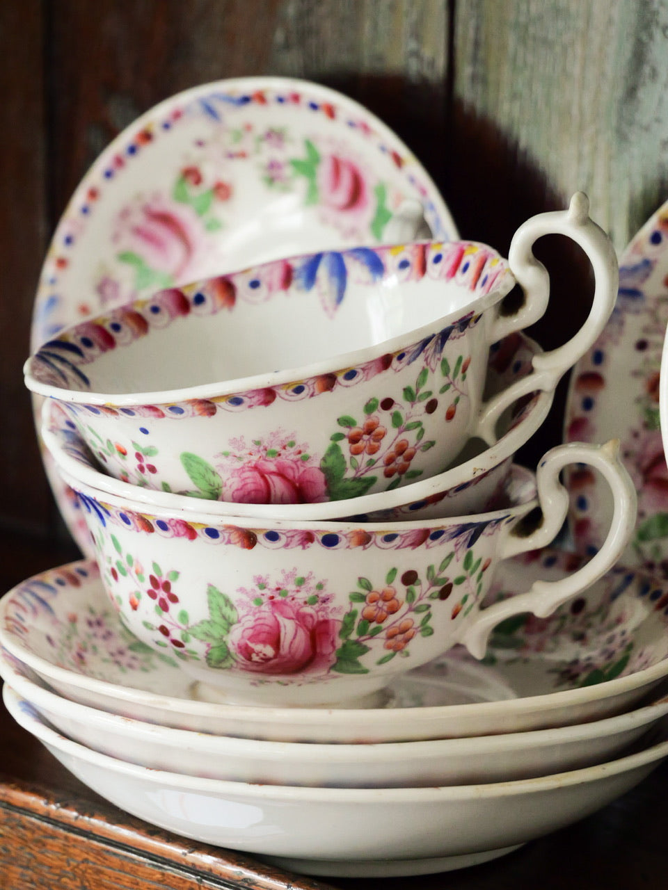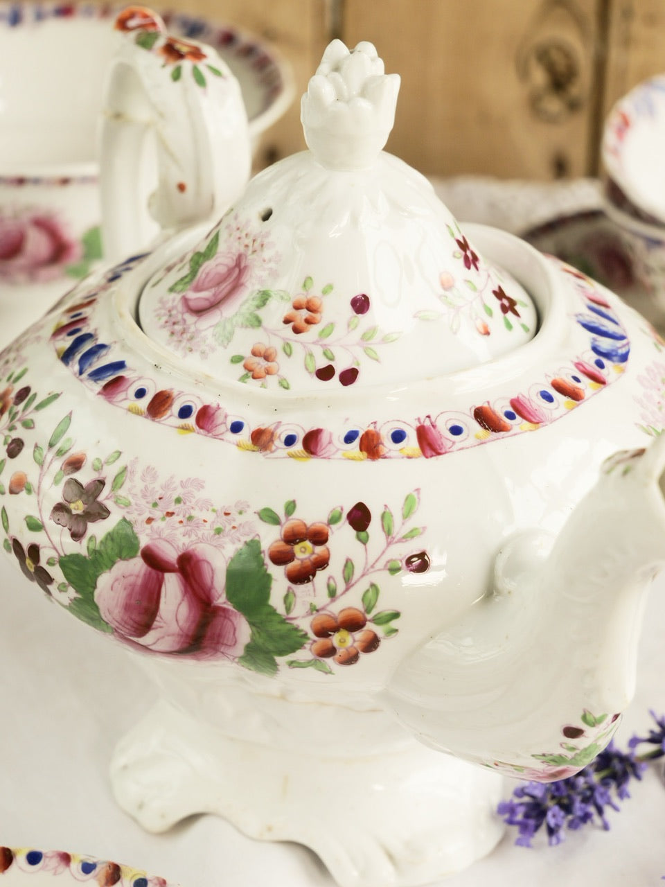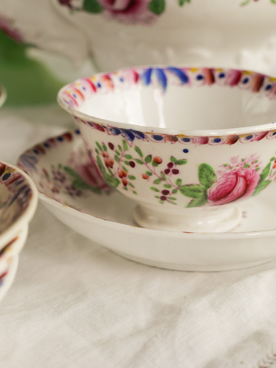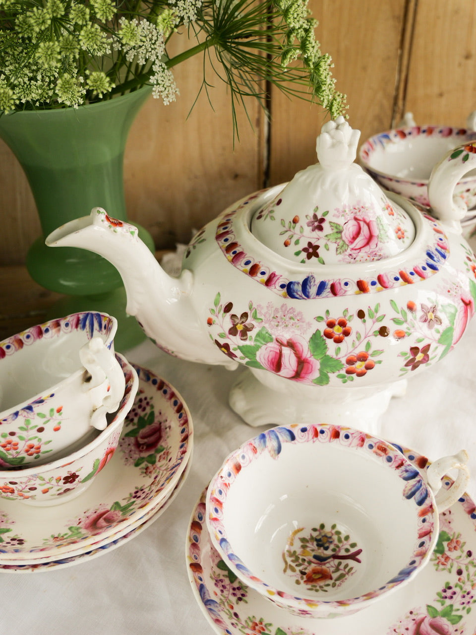 A rare and exquisite 13-piece Georgian tea set, c1810, comprising six cups and saucers and teapot by New Hall Staffordshire, each piece intricately hand painted with a delicate floral pattern. Makes a beautiful arrangement across a dresser.