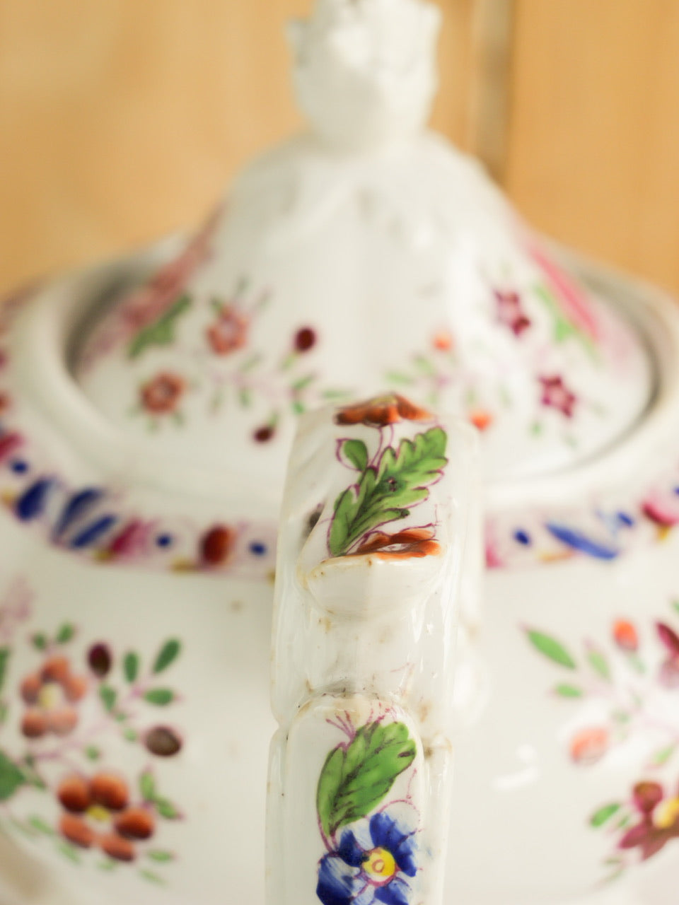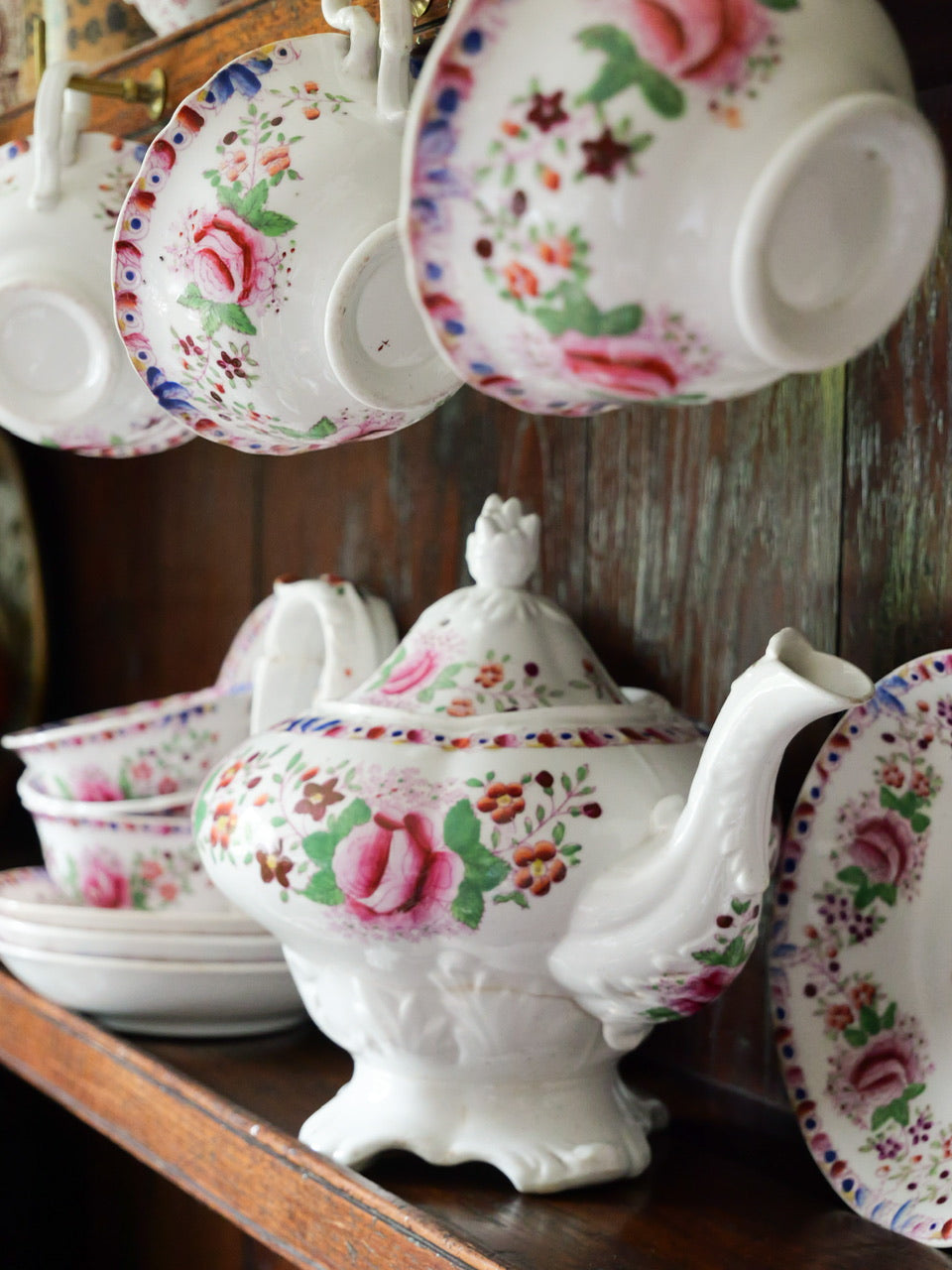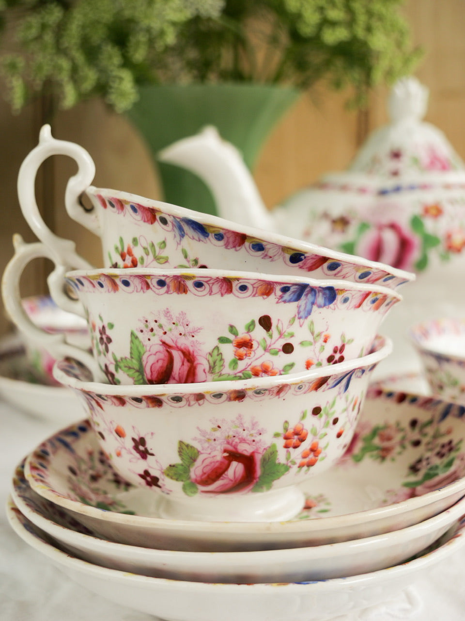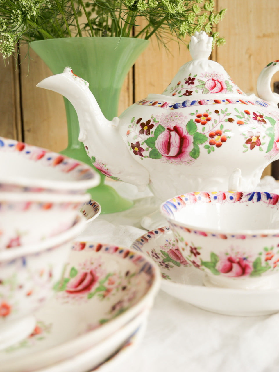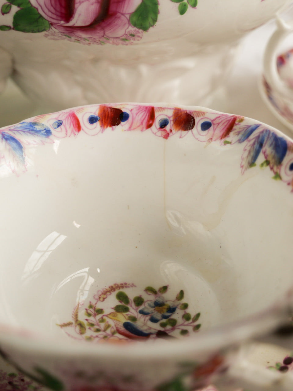 A rare and exquisite 13-piece Georgian tea set, c1810, comprising six cups and saucers and teapot by New Hall Staffordshire, each piece intricately hand painted with a delicate floral pattern. Makes a beautiful arrangement across a dresser.
