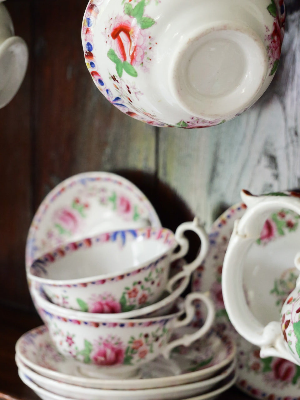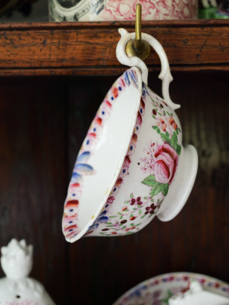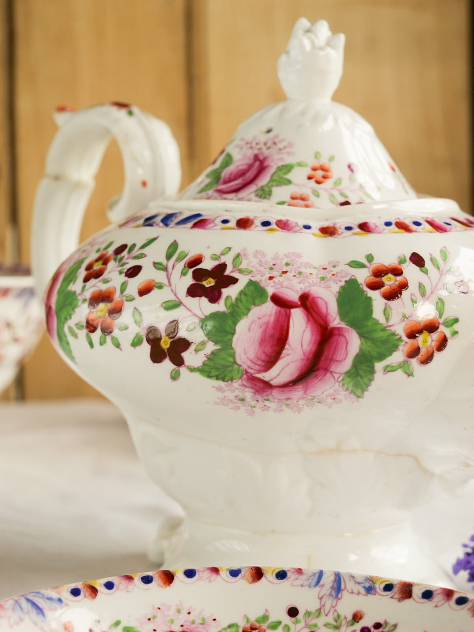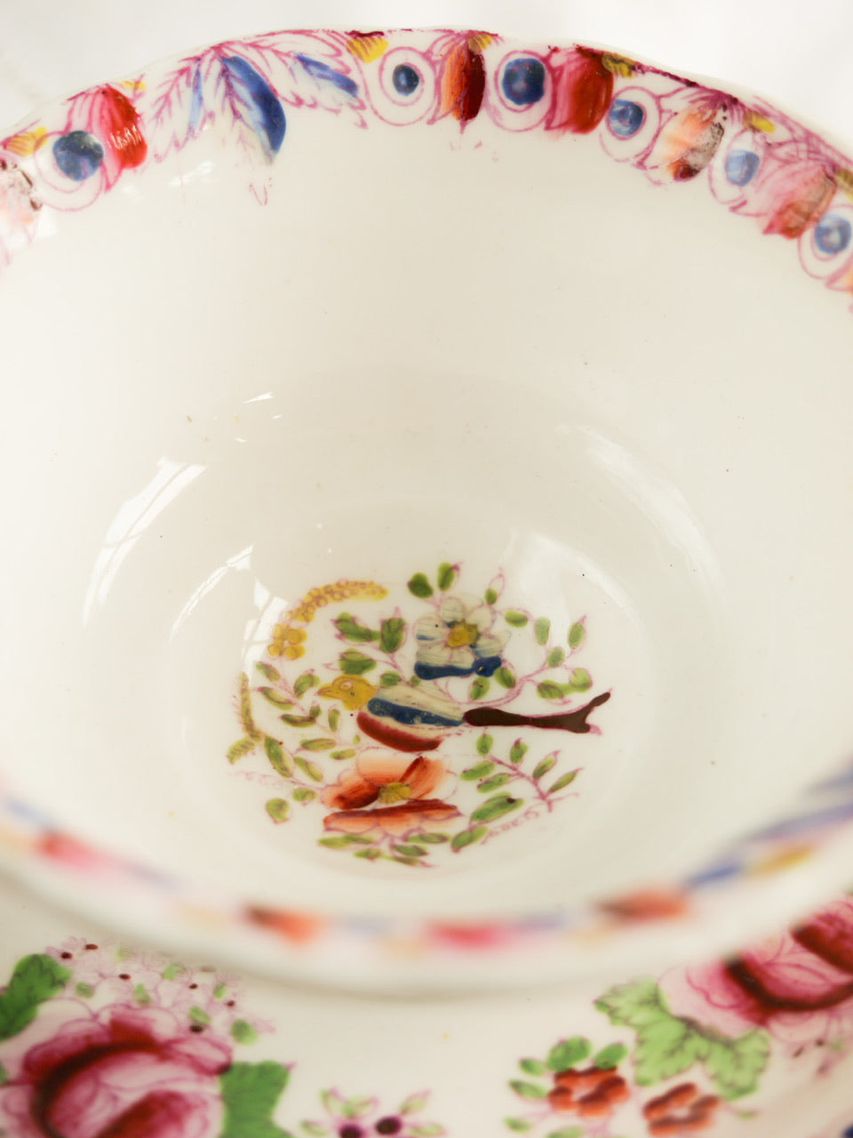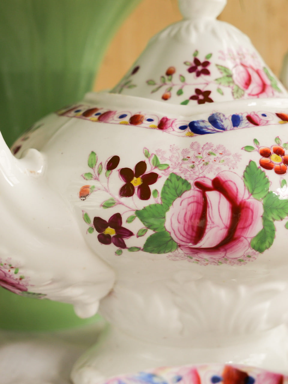 A rare and exquisite 13-piece Georgian tea set, c1810, comprising six cups and saucers and teapot by New Hall Staffordshire, each piece intricately hand painted with a delicate floral pattern. Makes a beautiful arrangement across a dresser.
