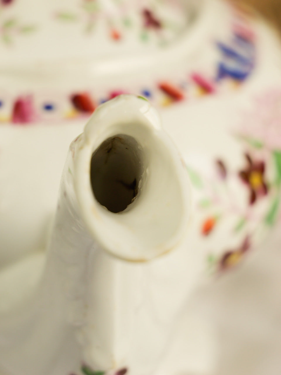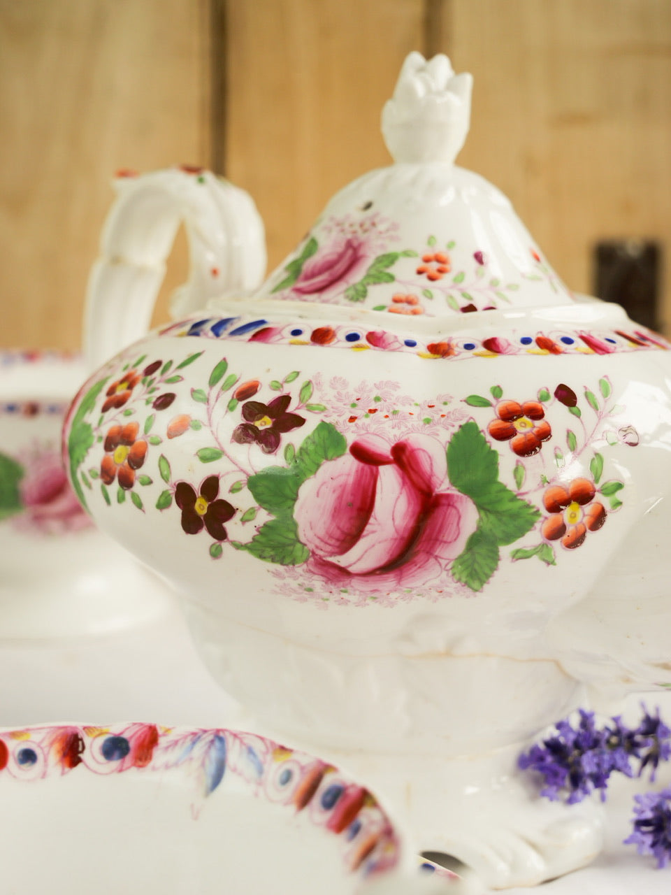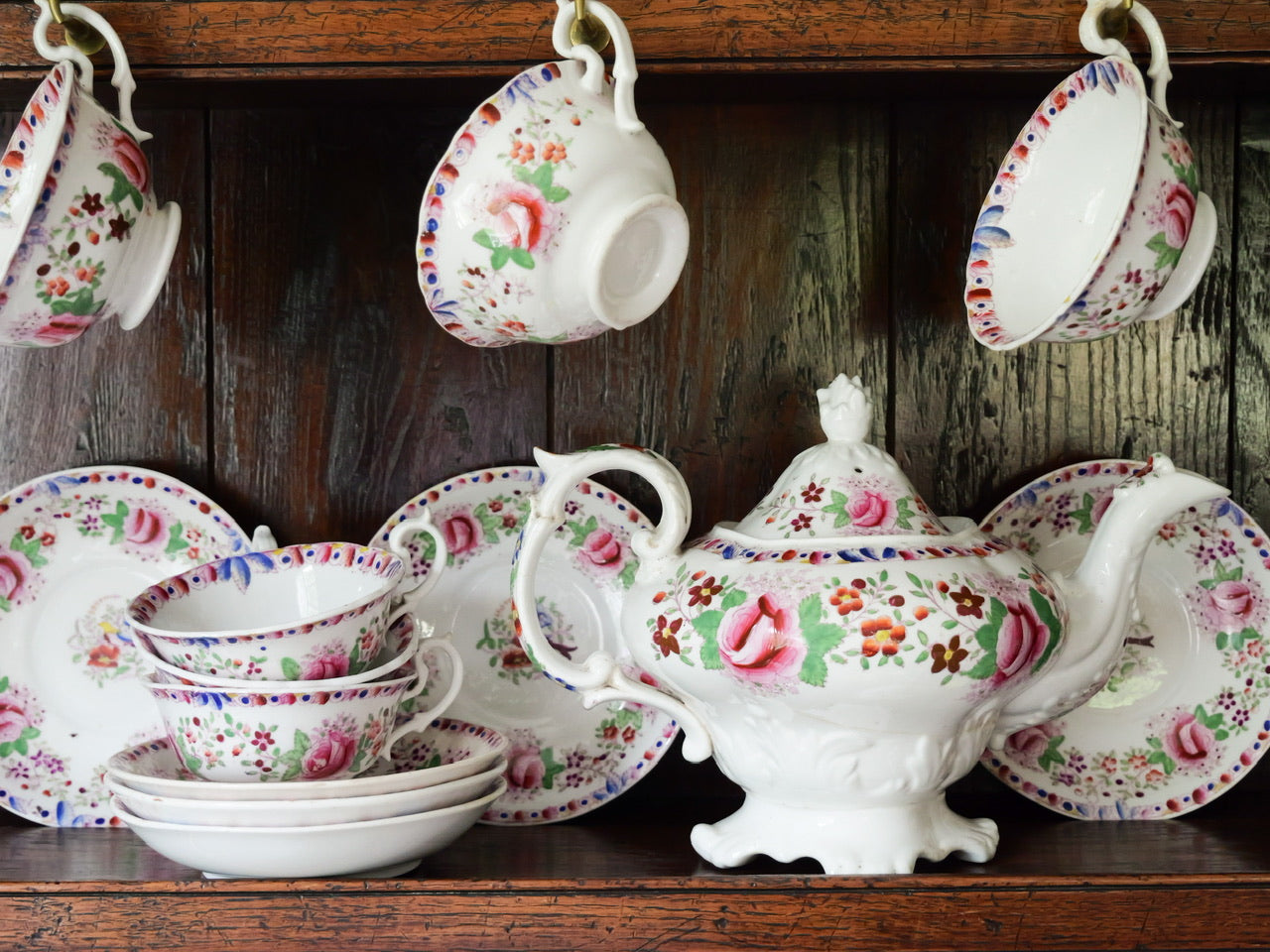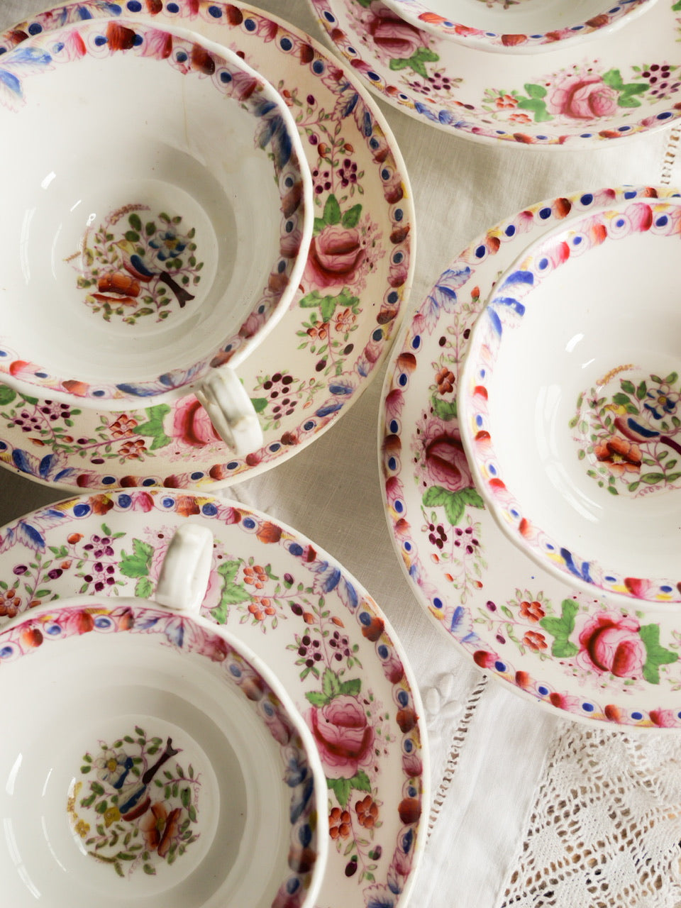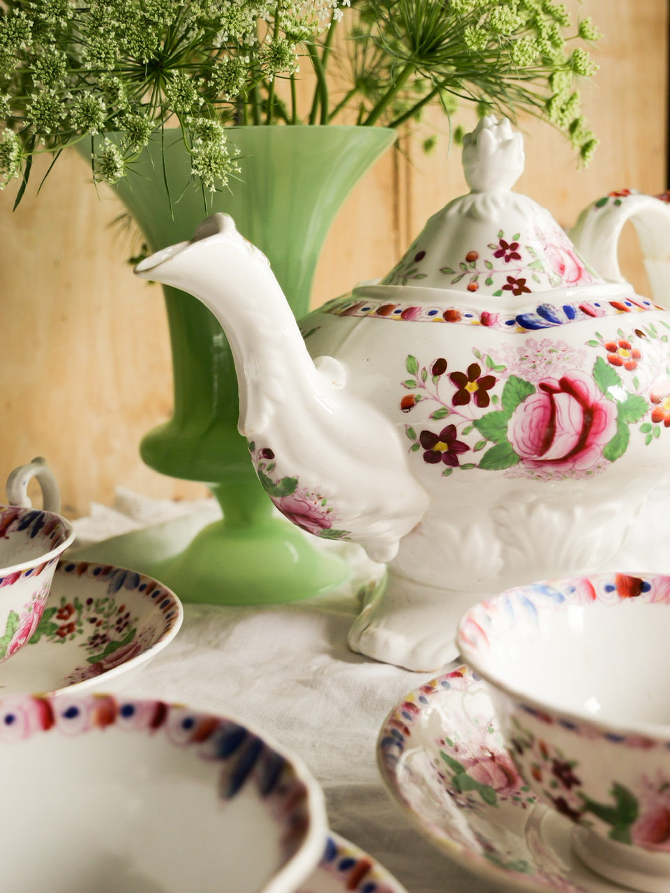 A rare and exquisite 13-piece Georgian tea set, c1810, comprising six cups and saucers and teapot by New Hall Staffordshire, each piece intricately hand painted with a delicate floral pattern. Makes a beautiful arrangement across a dresser.