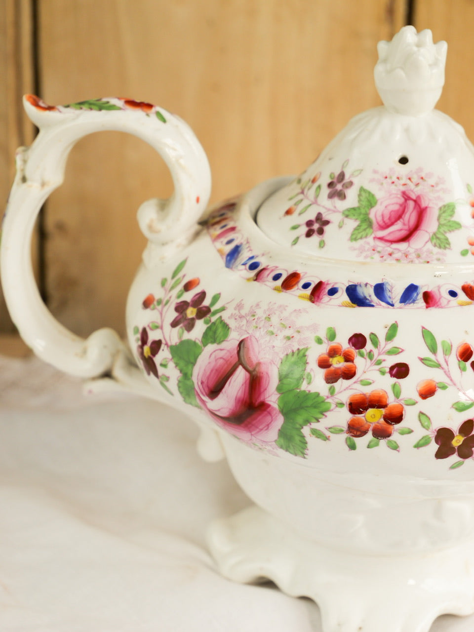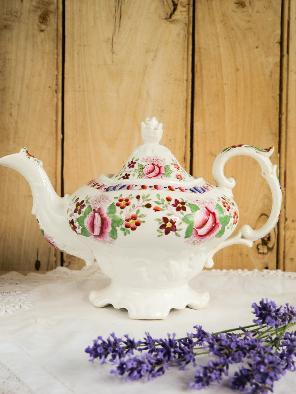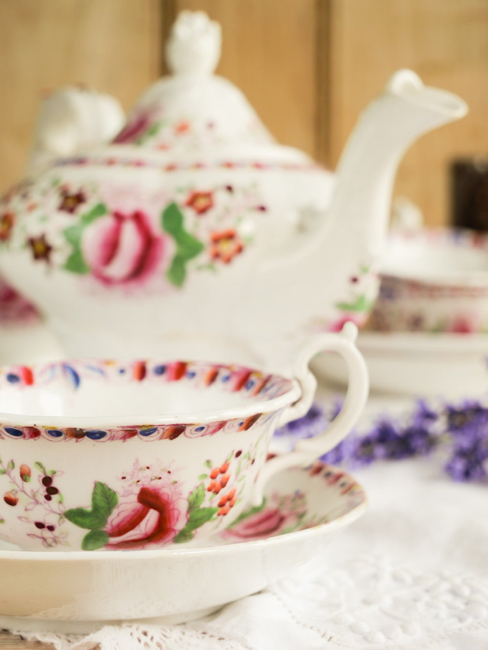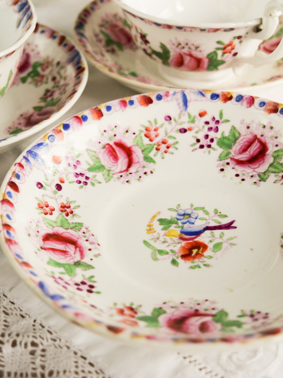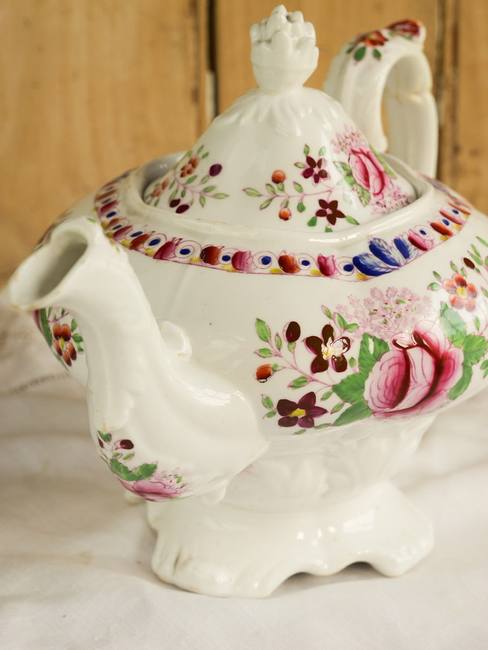 A rare and exquisite 13-piece Georgian tea set, c1810, comprising six cups and saucers and teapot by New Hall Staffordshire, each piece intricately hand painted with a delicate floral pattern. Makes a beautiful arrangement across a dresser.