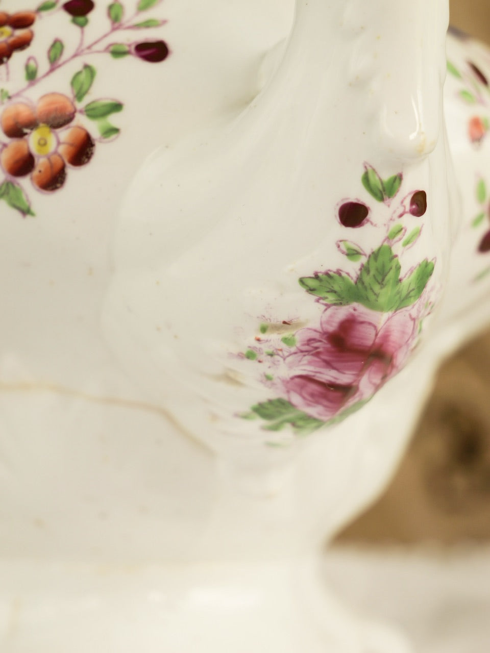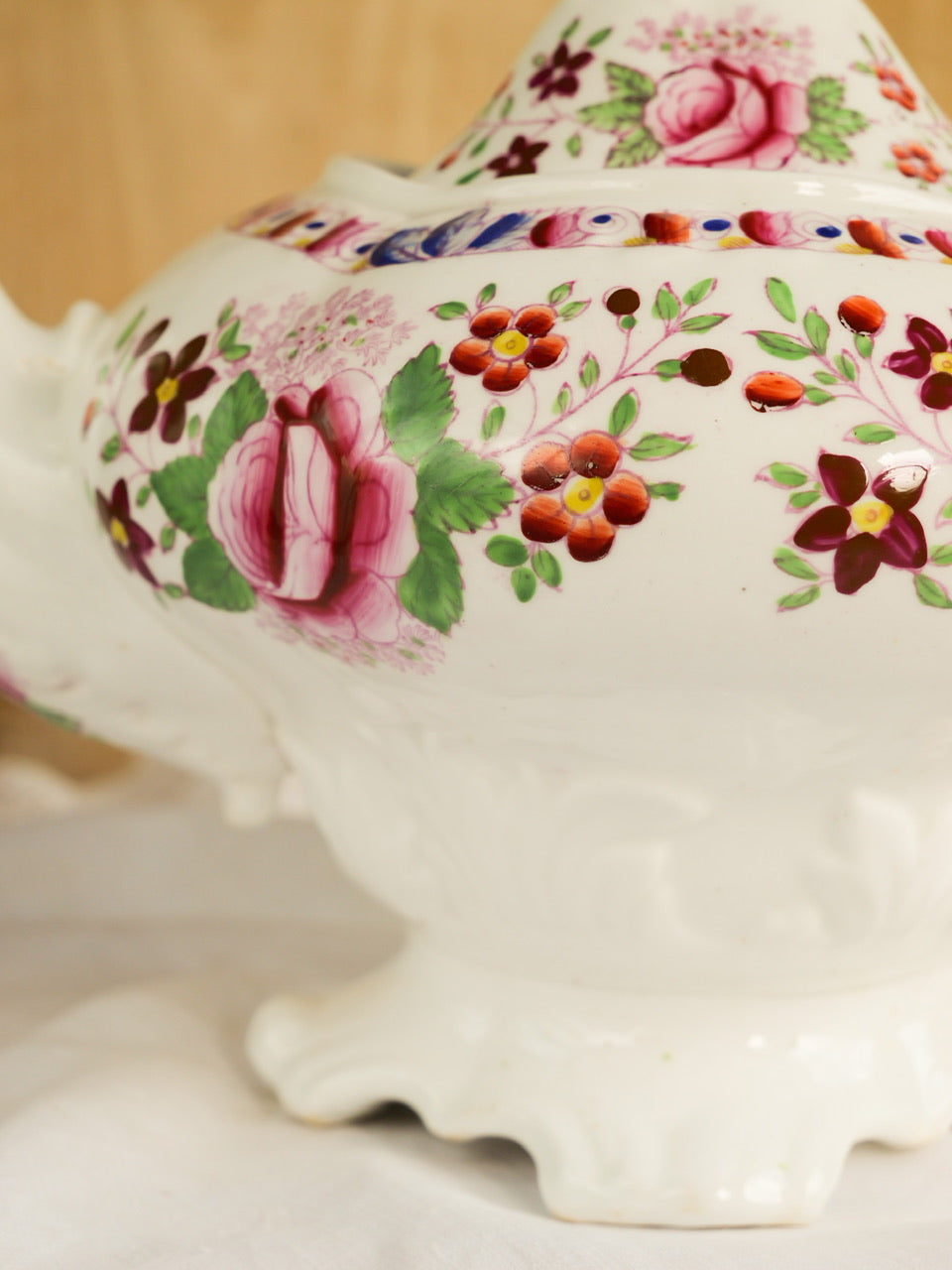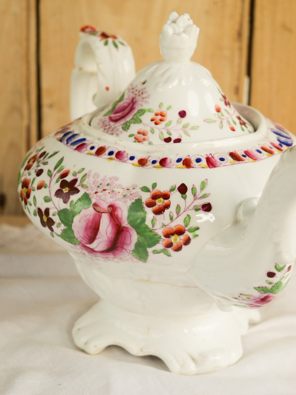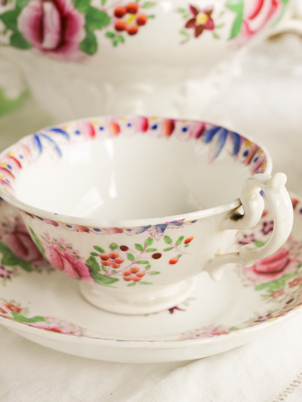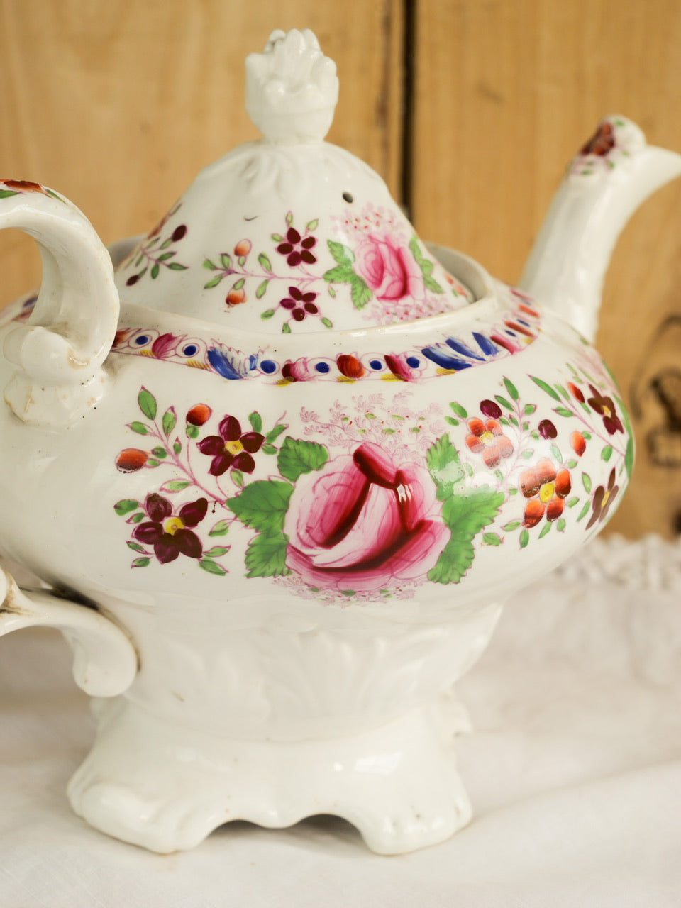 A rare and exquisite 13-piece Georgian tea set, c1810, comprising six cups and saucers and teapot by New Hall Staffordshire, each piece intricately hand painted with a delicate floral pattern. Makes a beautiful arrangement across a dresser.