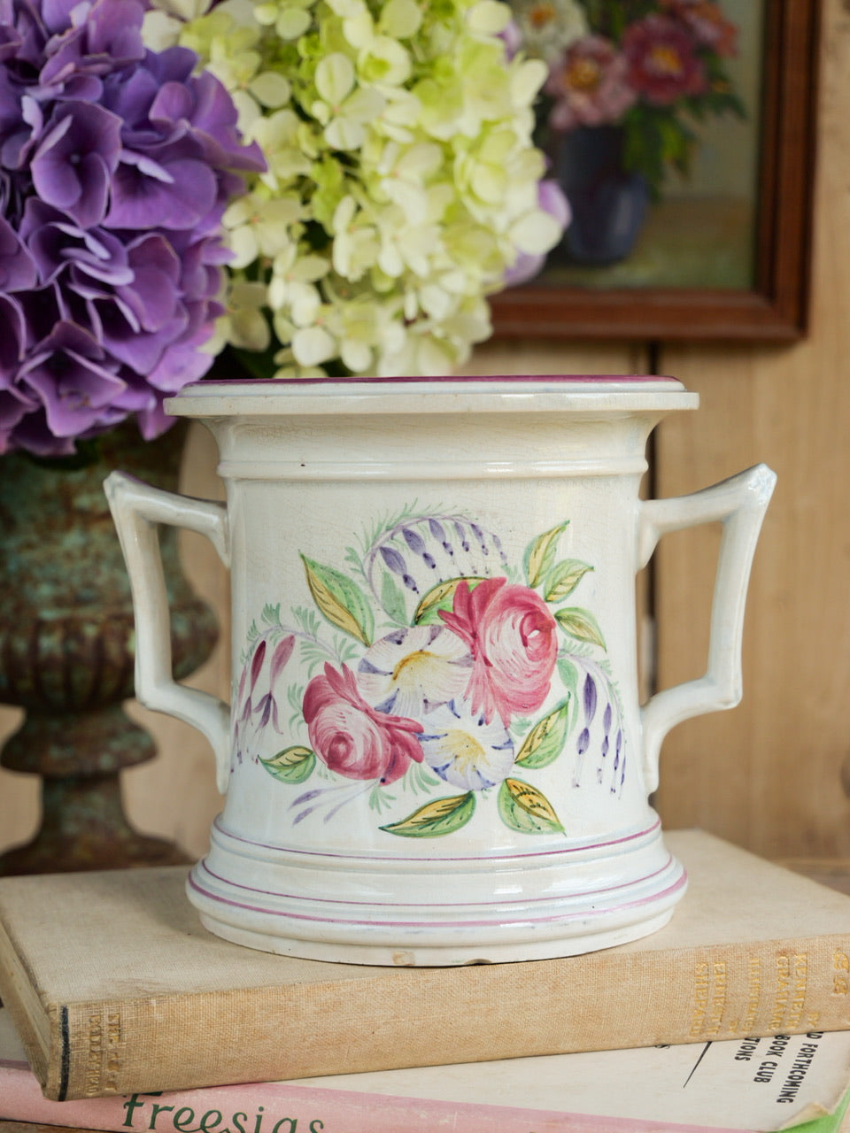 A stunning 19th century loving cup with beautiful hand painted floral decoration and name inscription with date to the reverse.