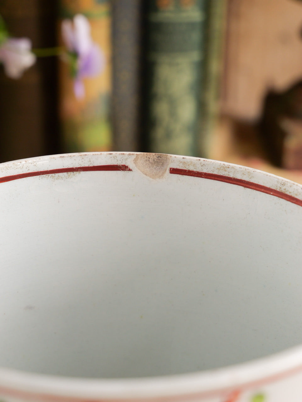 Some occasional paint loss, all over wear and hairline cracks as photographed. One shallow chip to the inner rim.