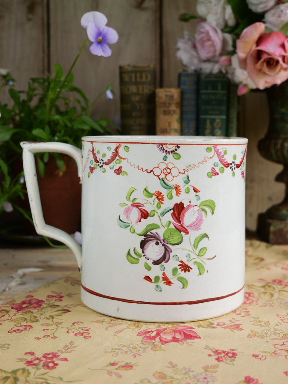A very large early 19th century hand painted pearlware mug with floral bouquets on either side and floral garlands around the rim of the mug.