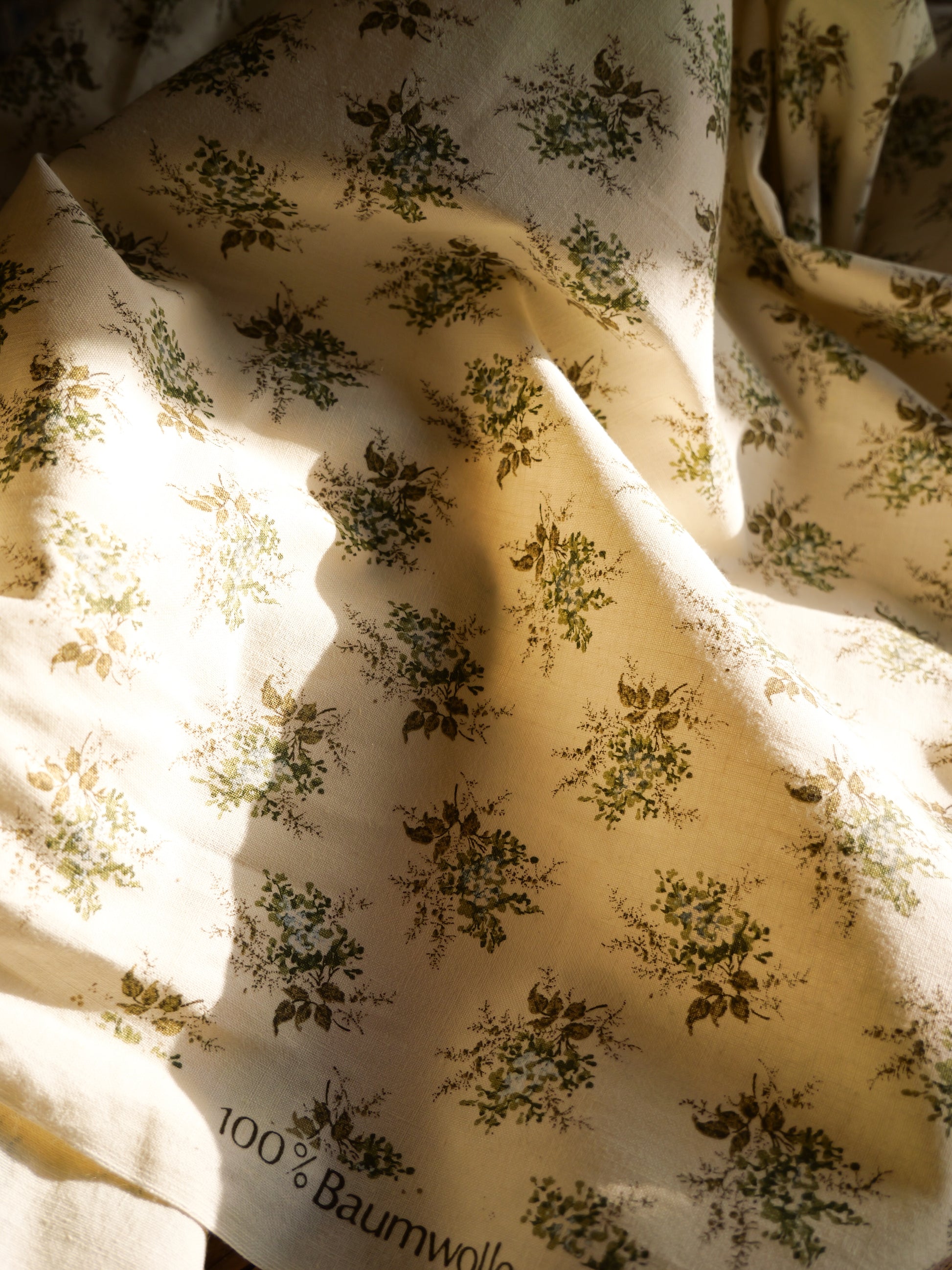 A length of unused vintage Baumwolle cotton featuring a delicate sprig pattern. The price is per metre, and orders for multiple metres will be supplied in one continuous length.