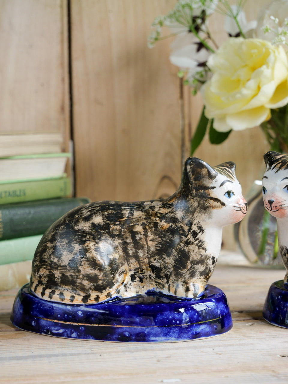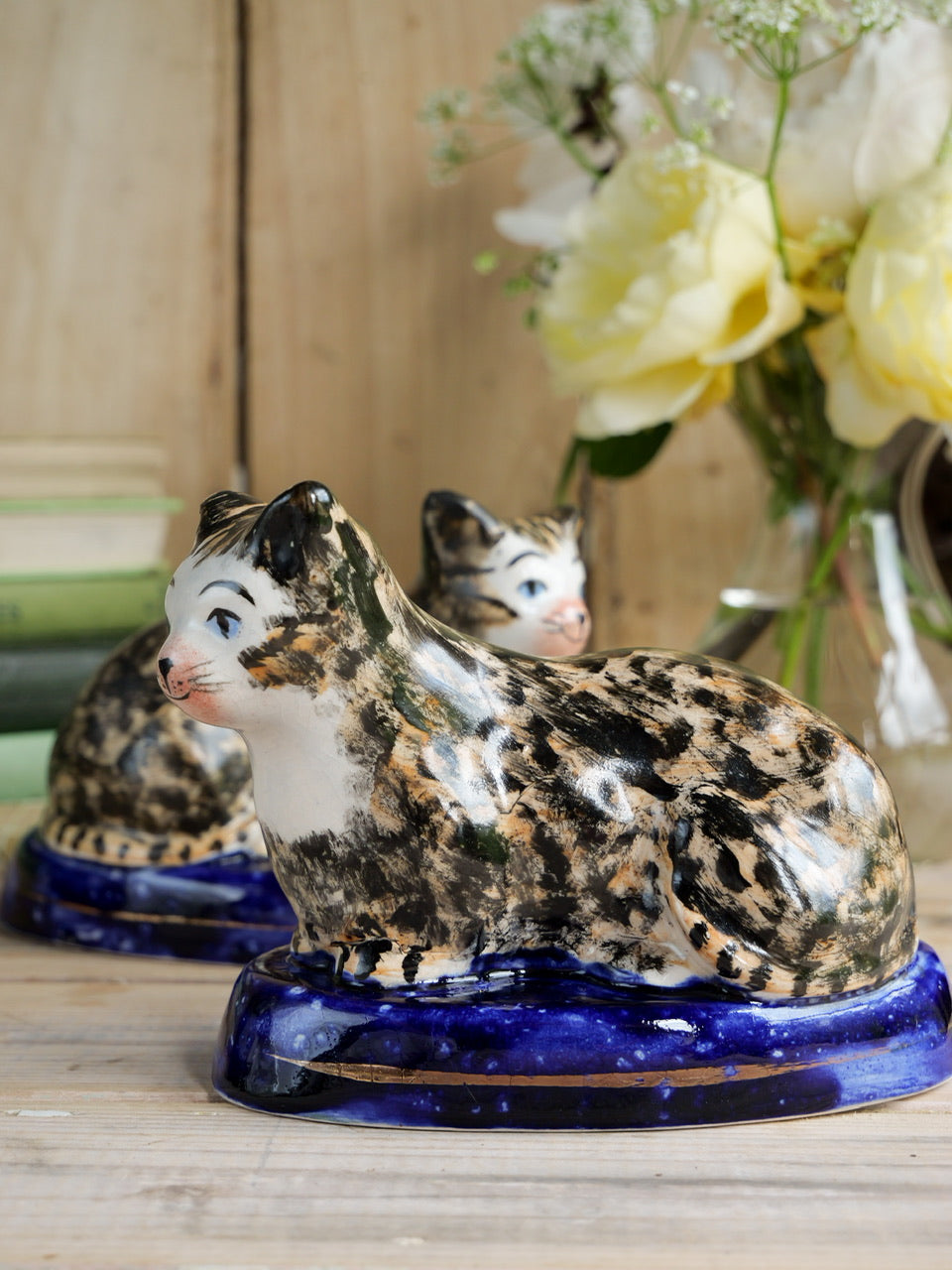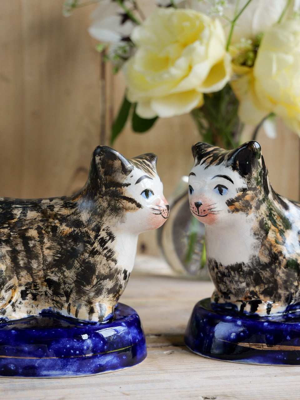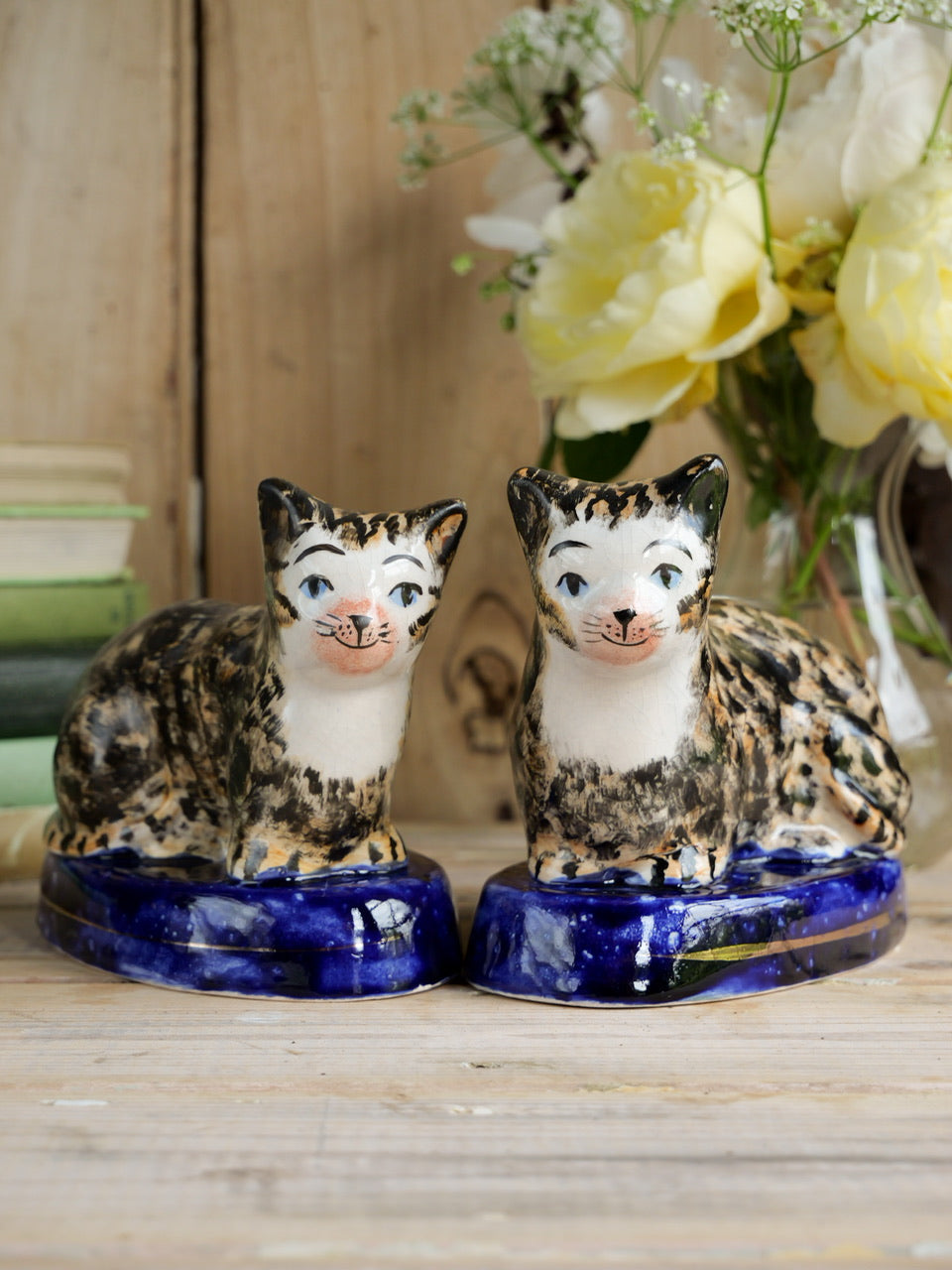 A fabulous pair of characterful hand painted Staffordshire cats. Perfect for sitting on the mantelpiece, or for use as bookends.