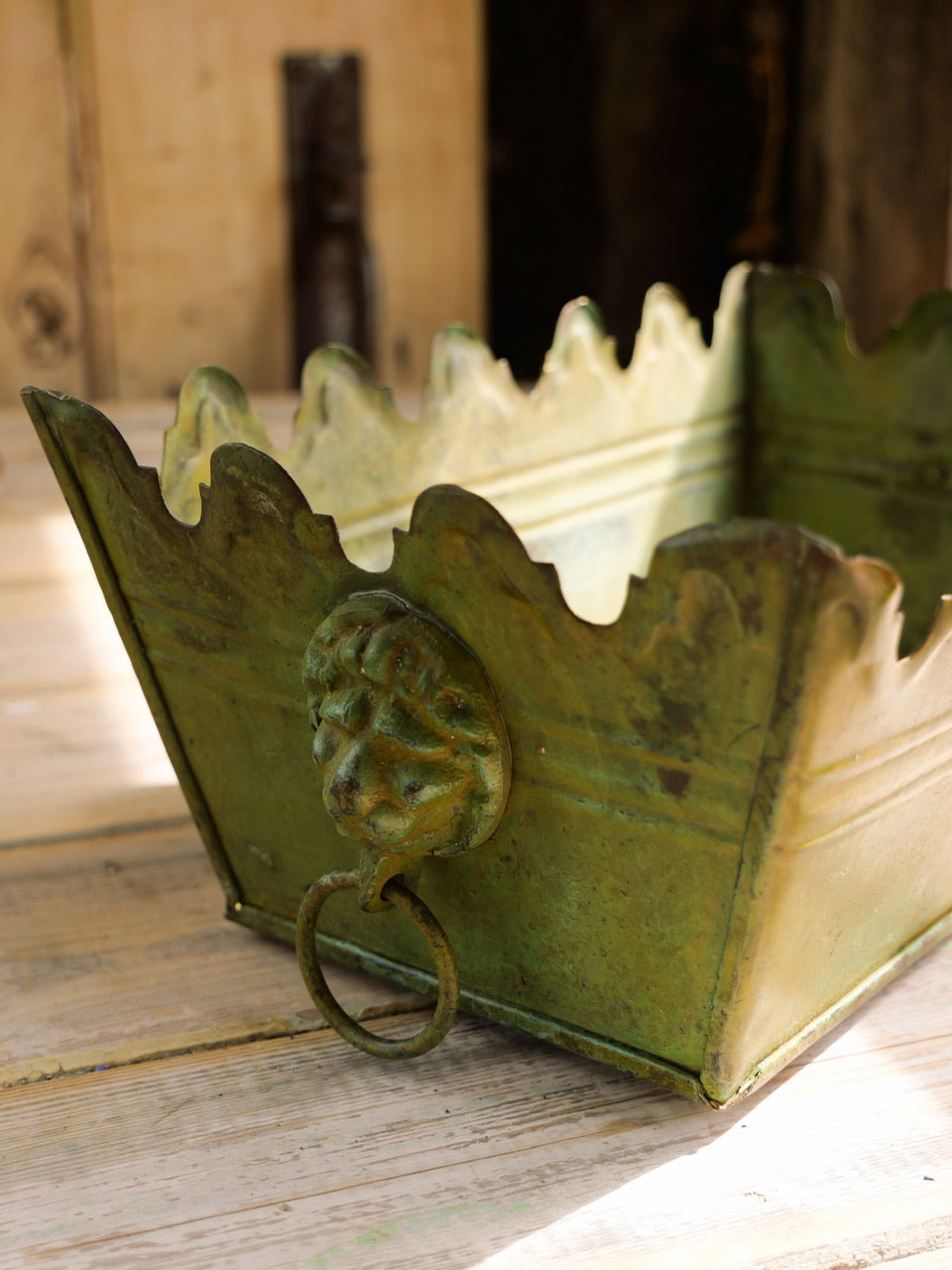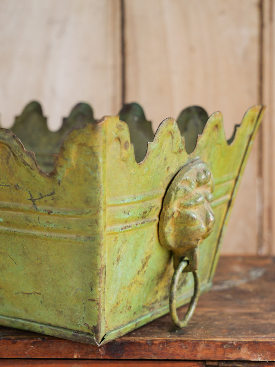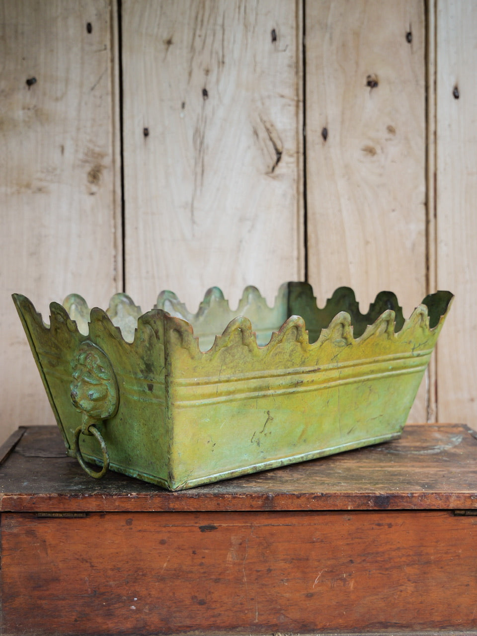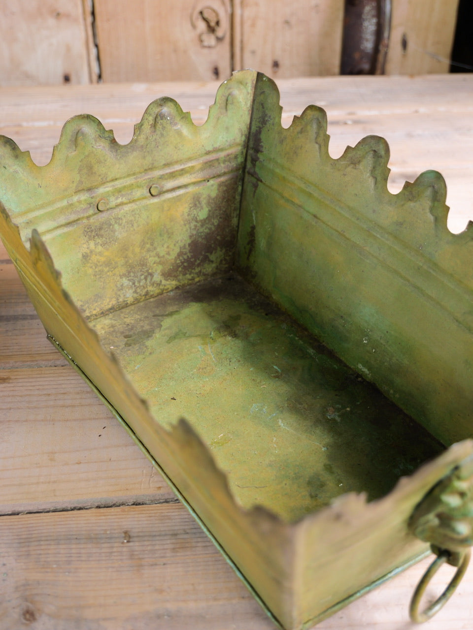 A super little metal toleware trough with scalloped edges and lions head handles, in beautiful original paint, ideal as a planter for use inside or out.