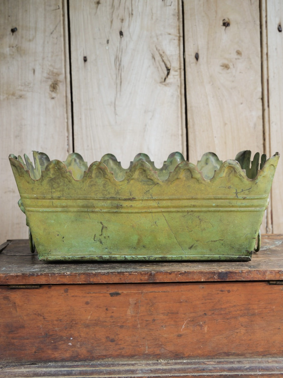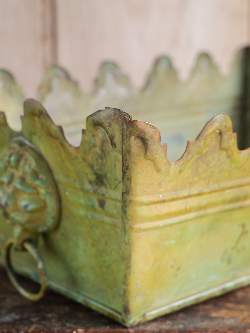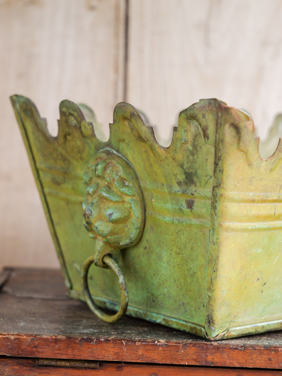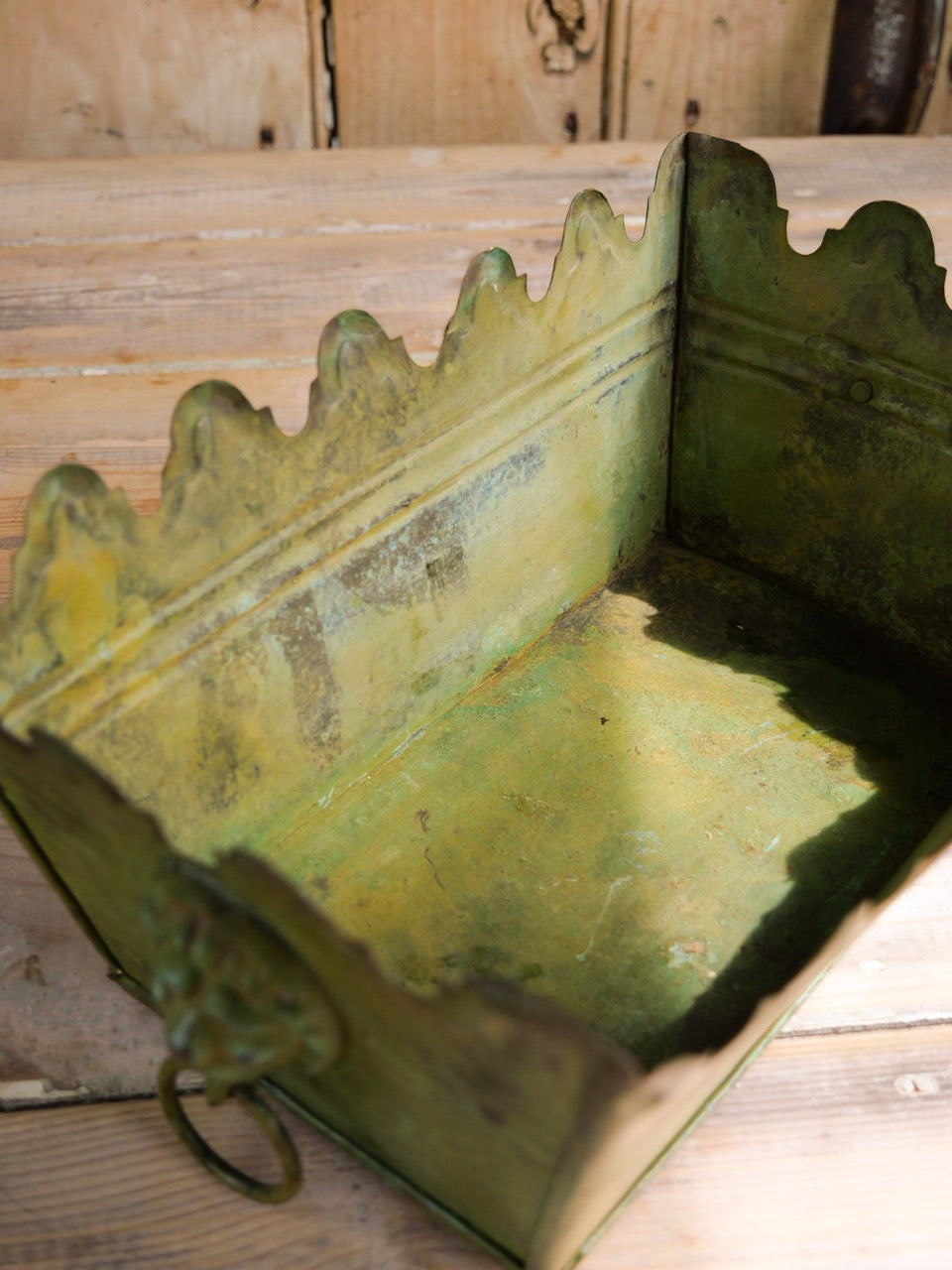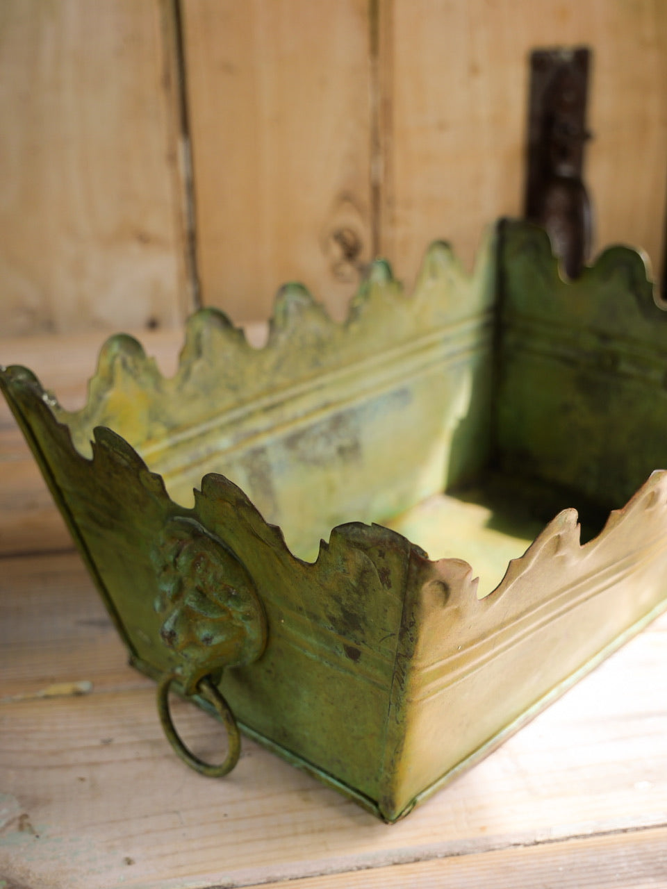 A super little metal toleware trough with scalloped edges and lions head handles, in beautiful original paint, ideal as a planter for use inside or out.