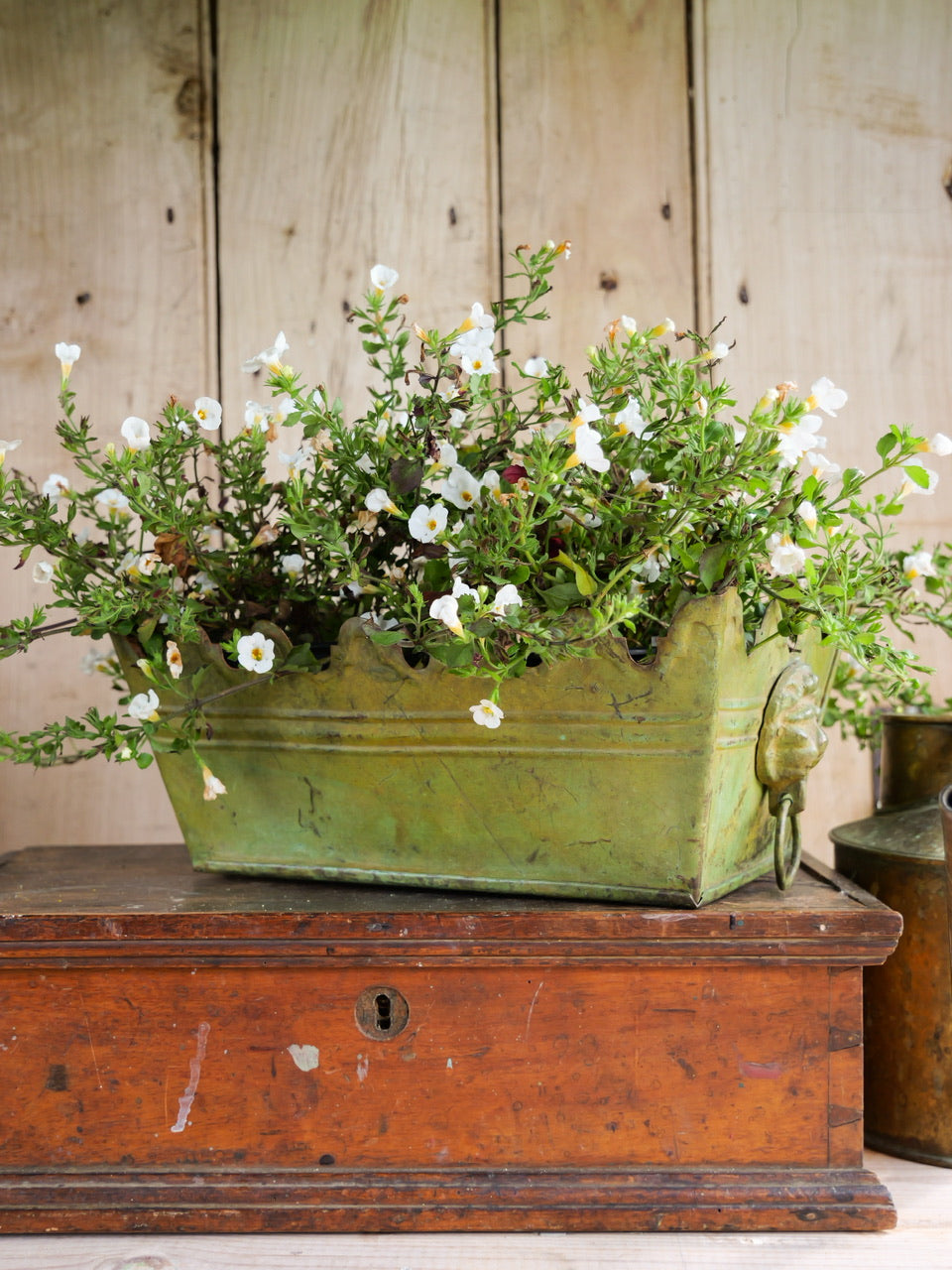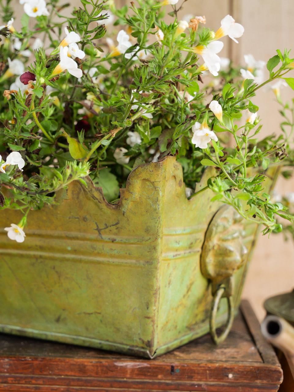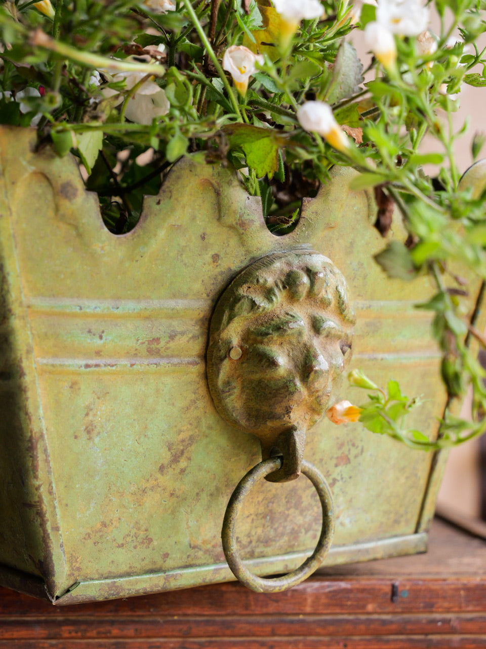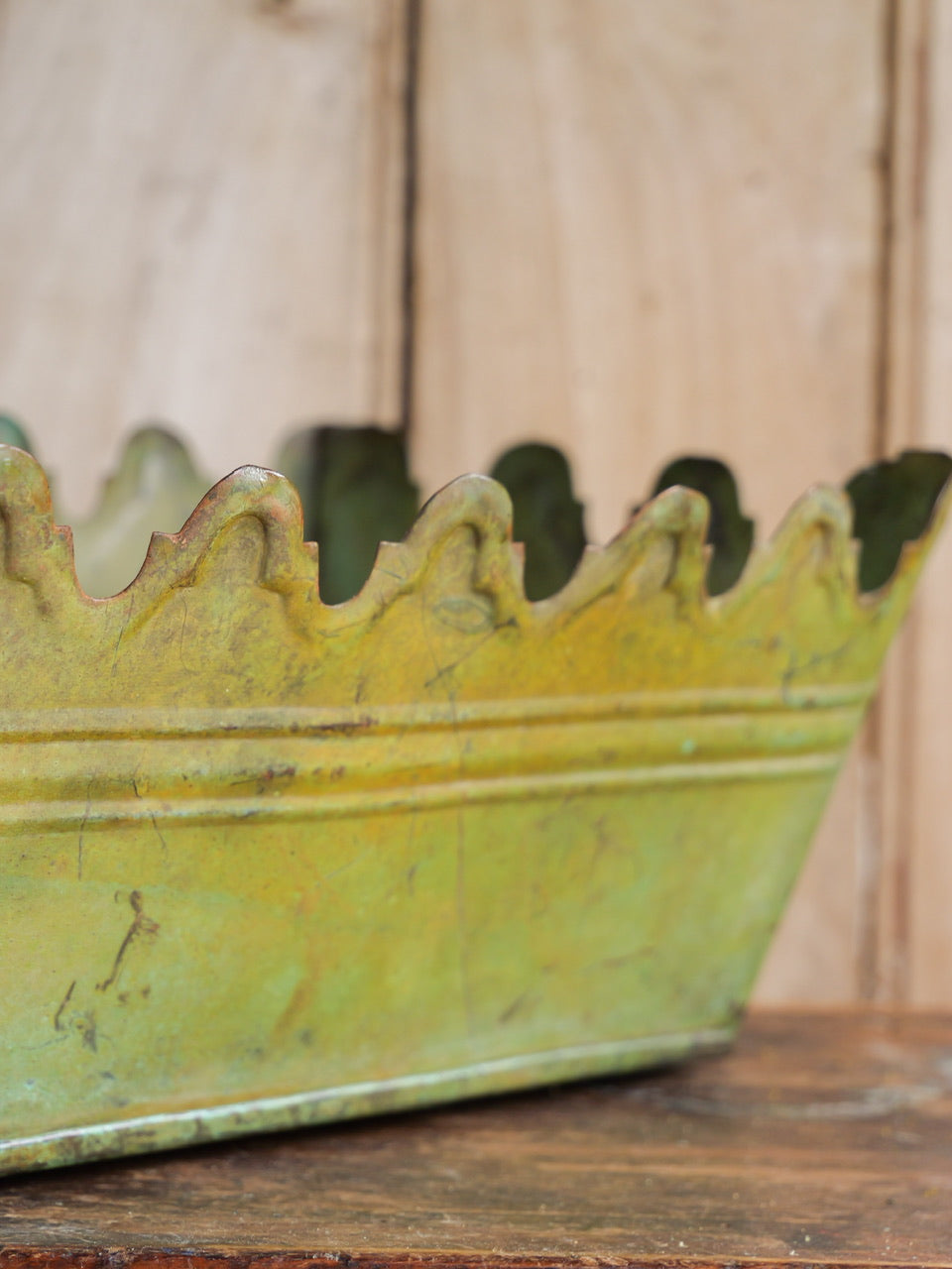 A super little metal toleware trough with scalloped edges and lions head handles, in beautiful original paint, ideal as a planter for use inside or out.