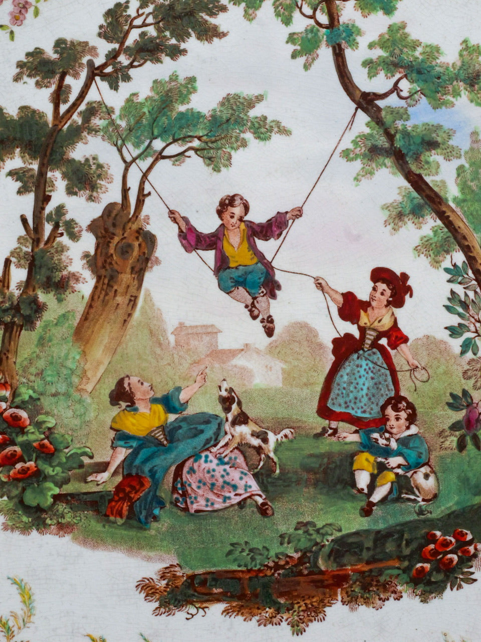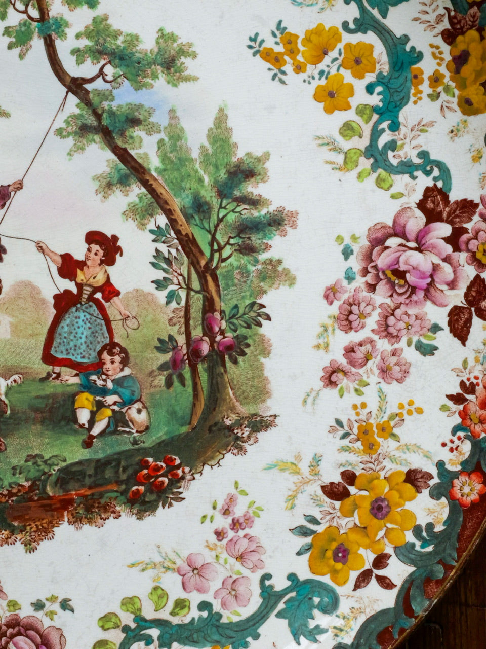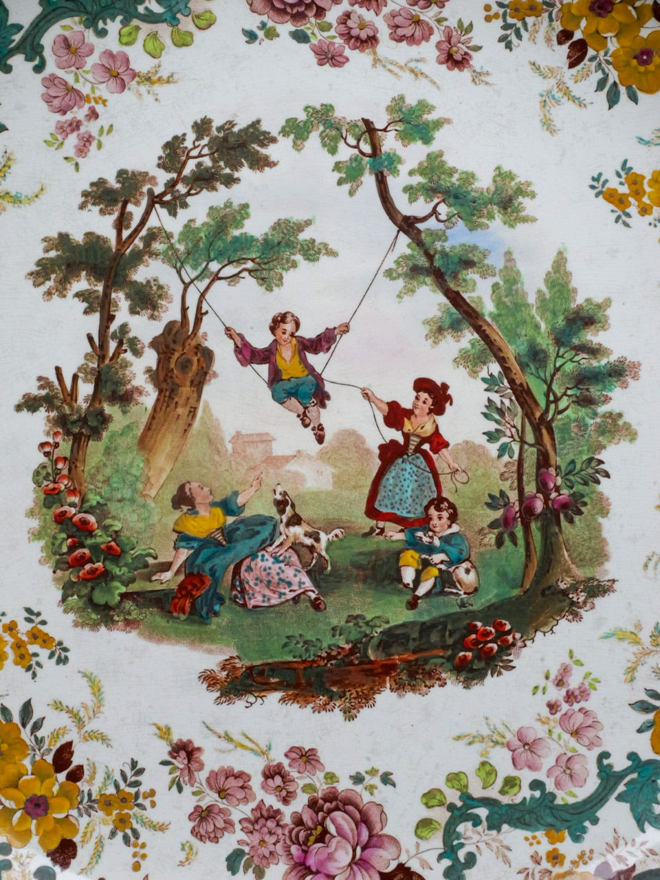 An exceptionally large antique Mintons charger plate from circa 1873-1891 with vibrant floral decoration and a central scene of two women and children with a dog. Hand finished. Gilding to rim.
