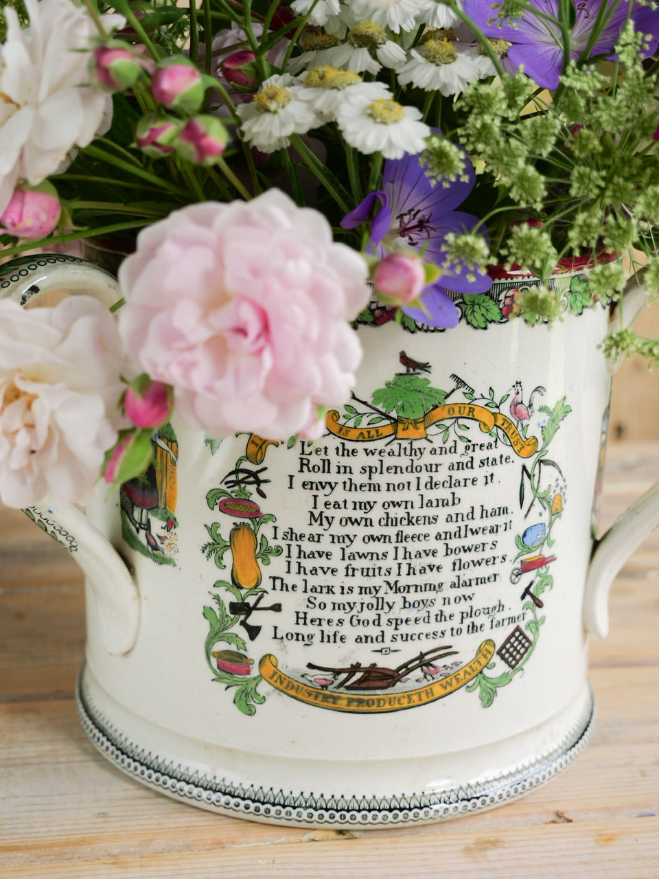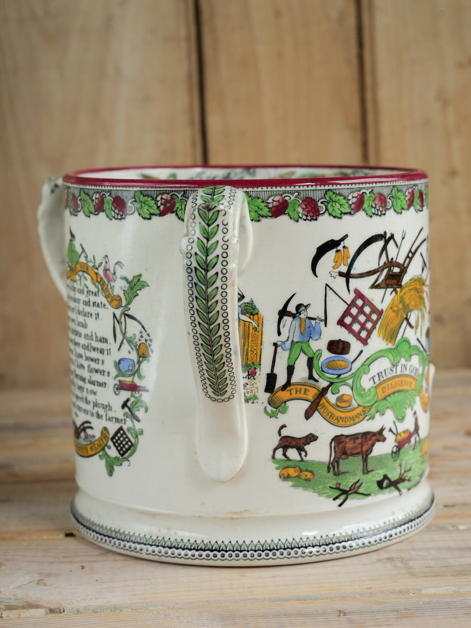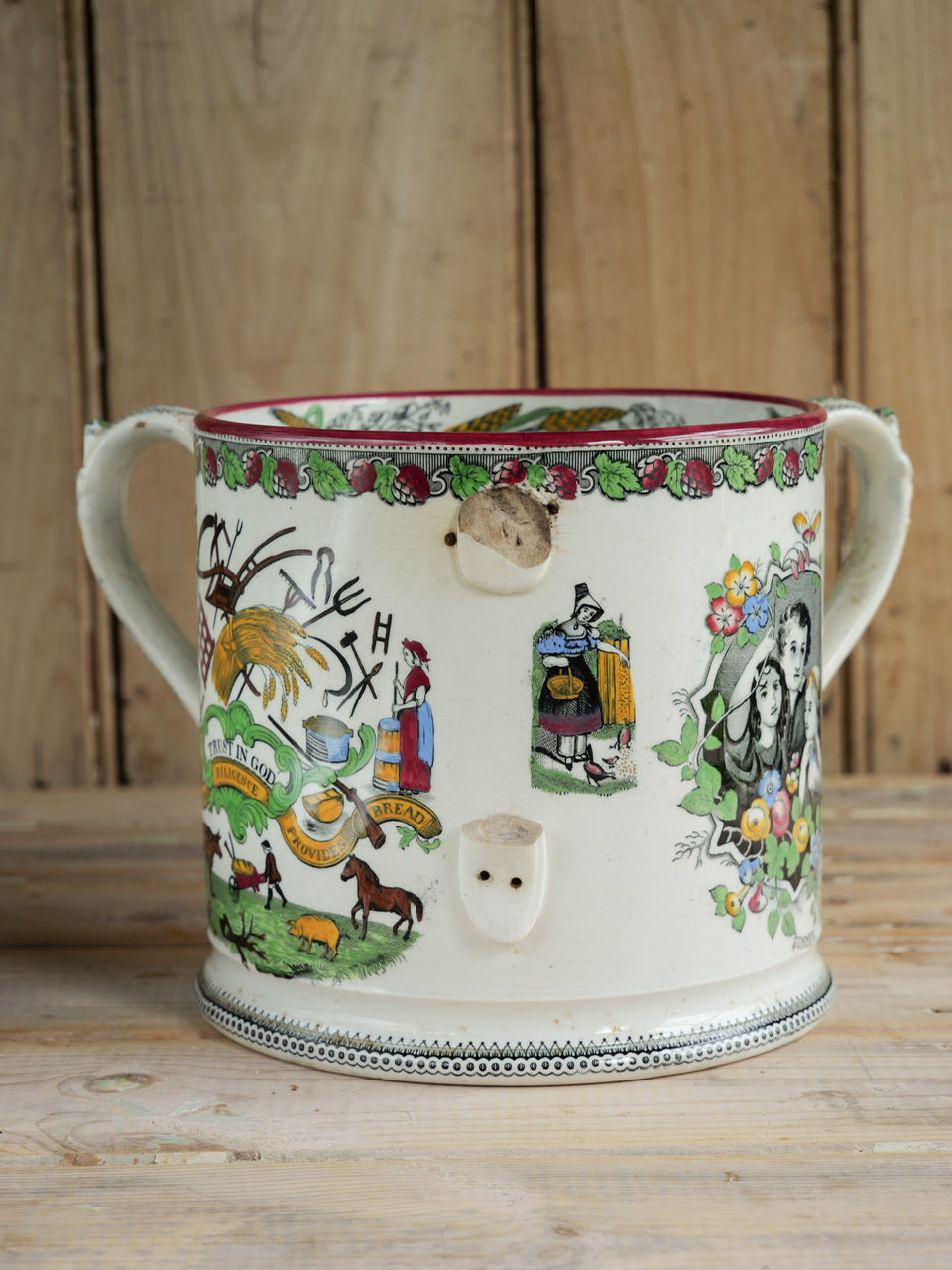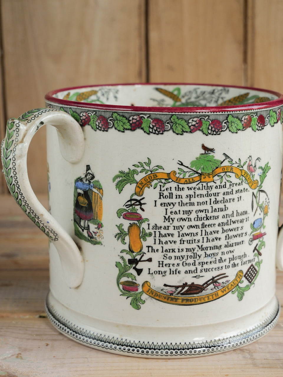 A very scarce huge 19th century ‘Farmers Arms’ tyg with beautiful transfers, verse and hand painted detail all over and inside. Sadly it is missing a handle, though it is still an exceptional piece and perfectly functional. Priced accordingly.