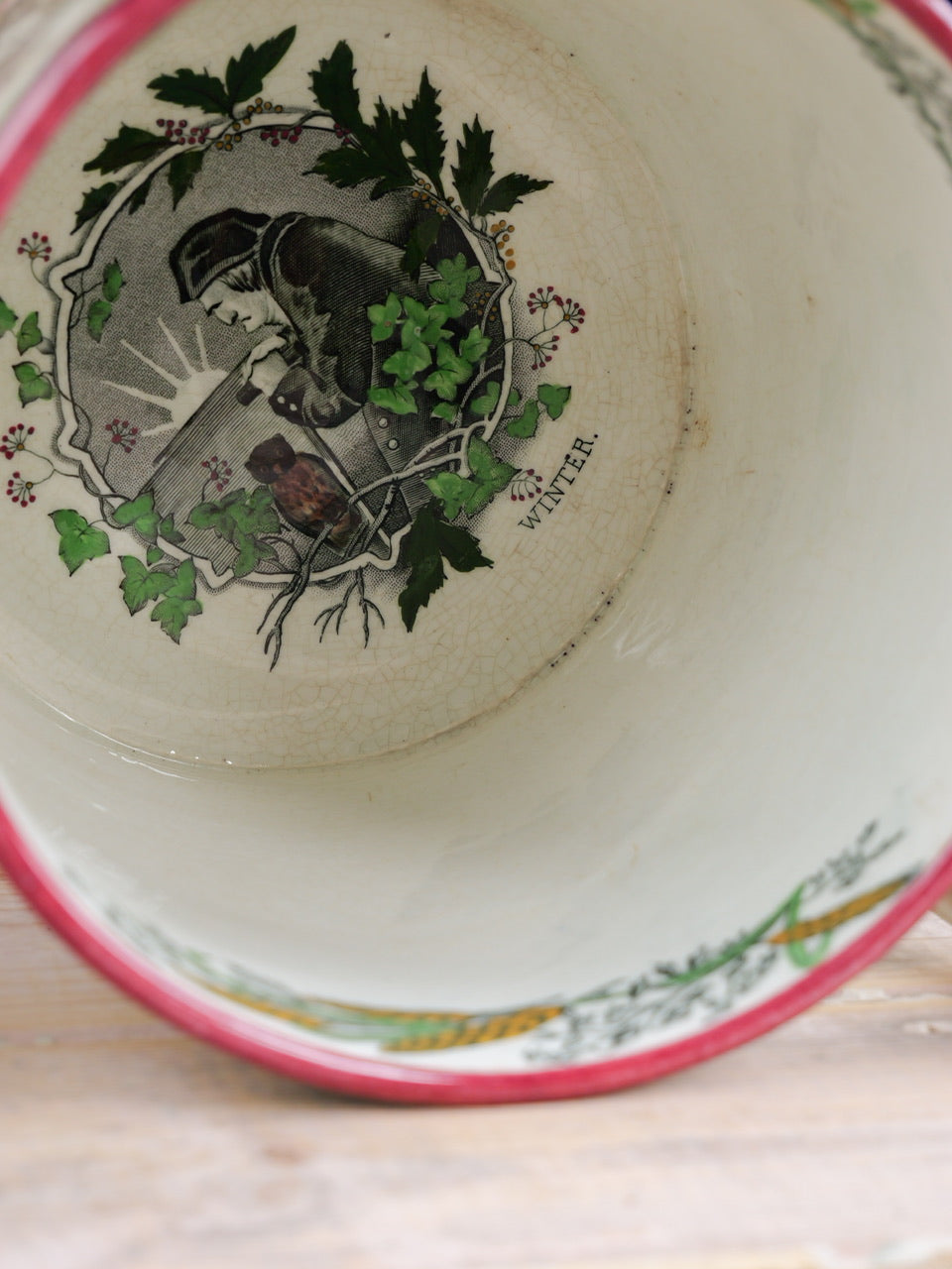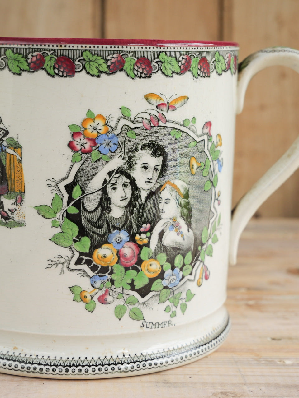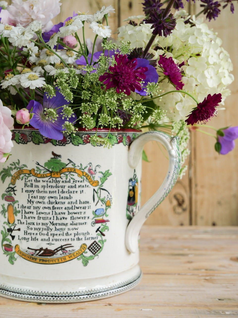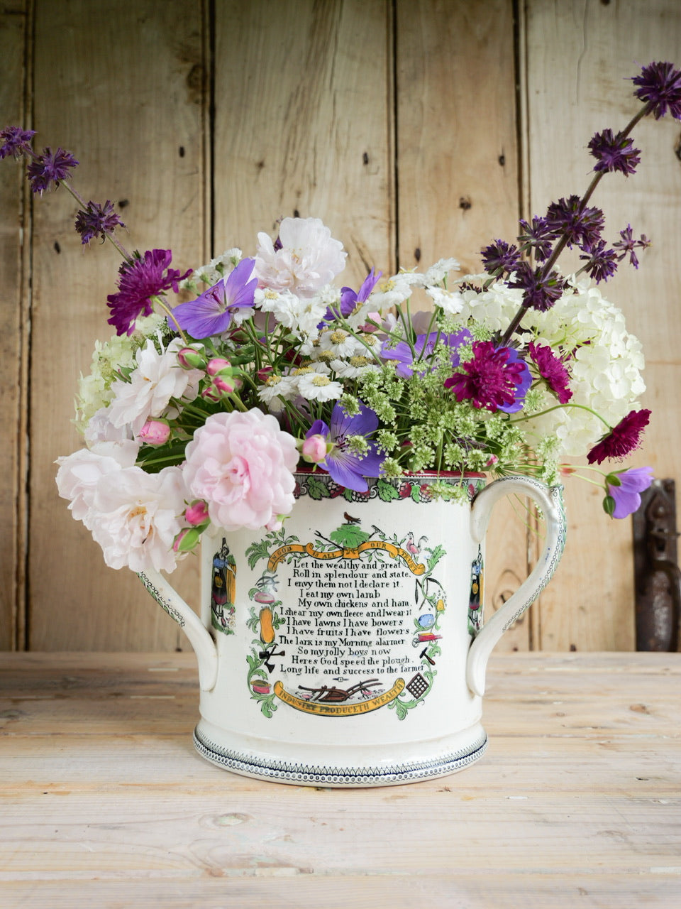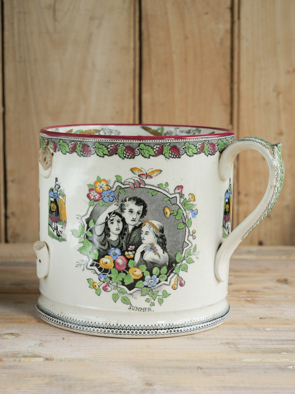 A very scarce huge 19th century ‘Farmers Arms’ tyg with beautiful transfers, verse and hand painted detail all over and inside. Sadly it is missing a handle, though it is still an exceptional piece and perfectly functional. Priced accordingly.