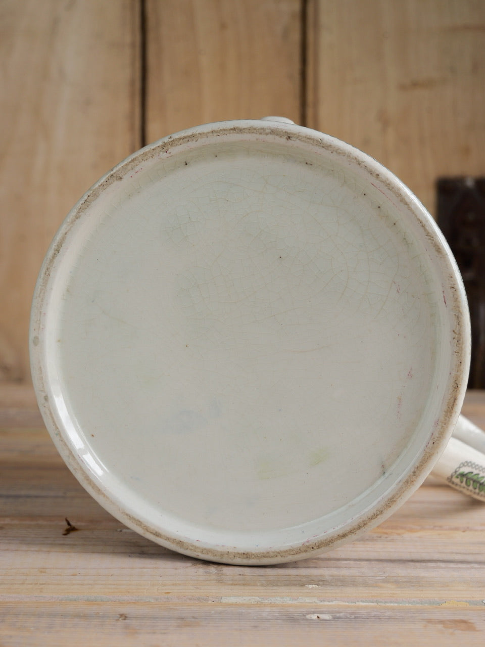 Some light crazing and wear consistent with age. Handle missing. Watertight.