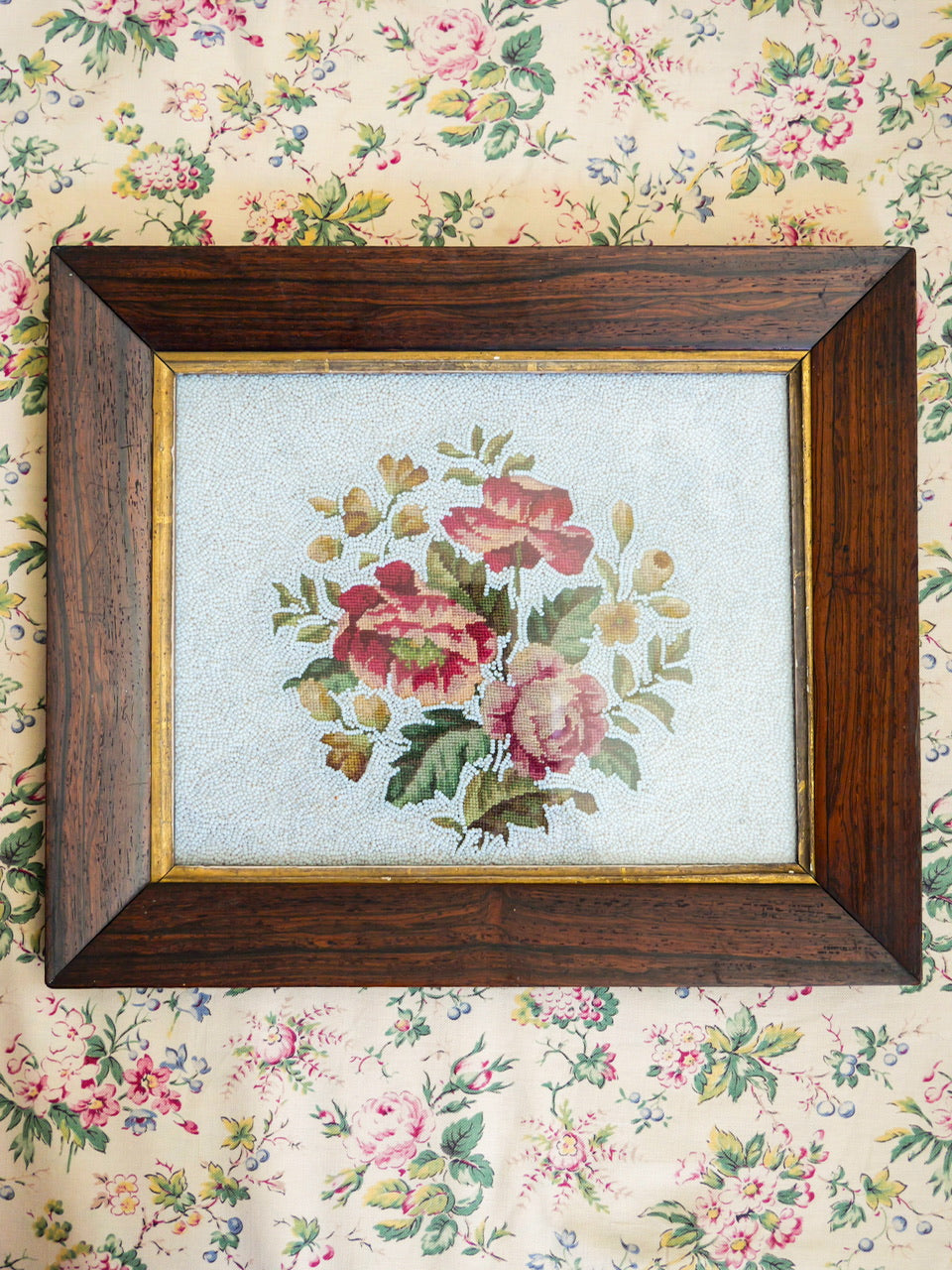 A stunning Victorian beadwork tapestry set in a beautiful antique oak frame with gilt slip. Glazed.