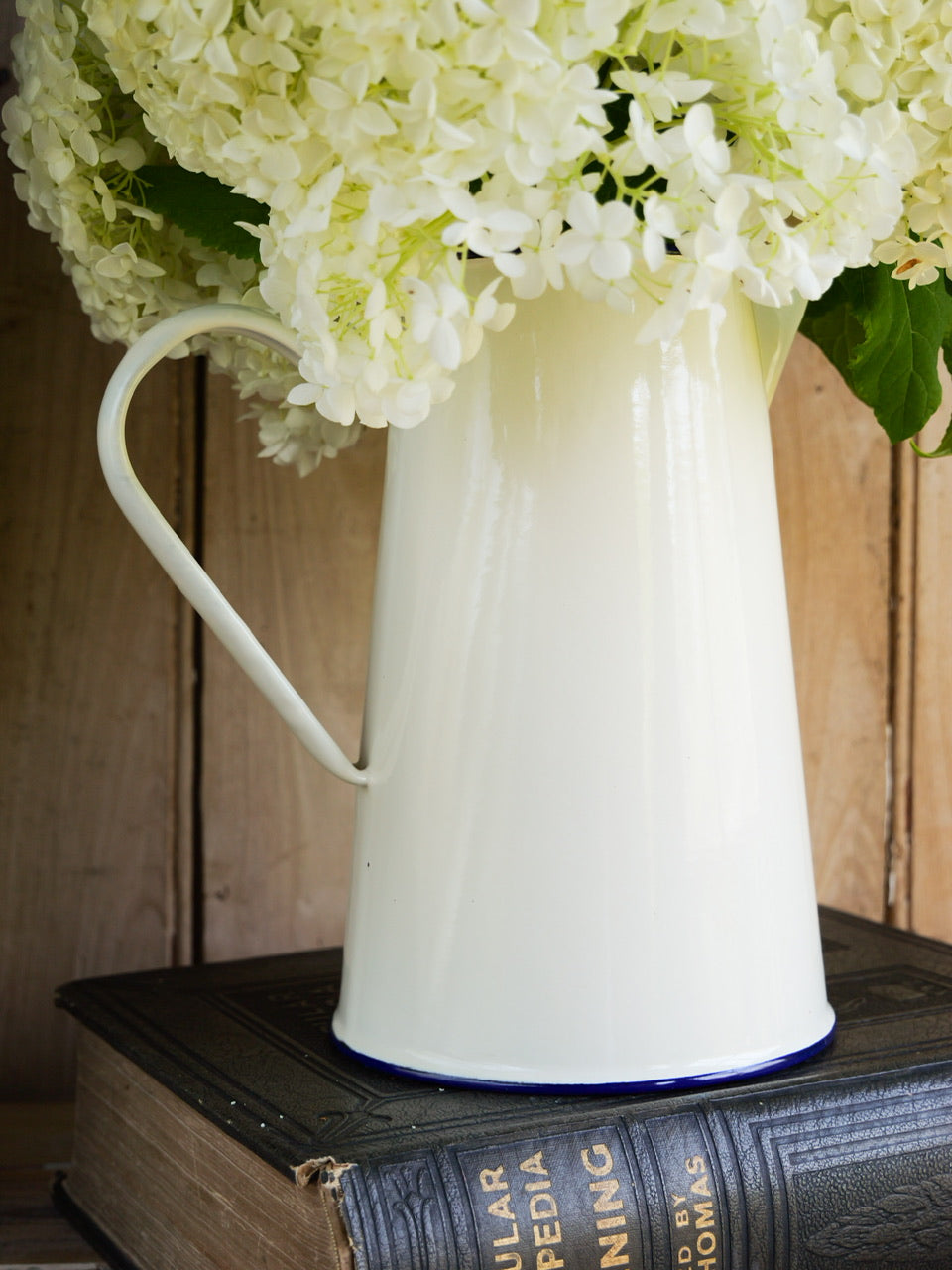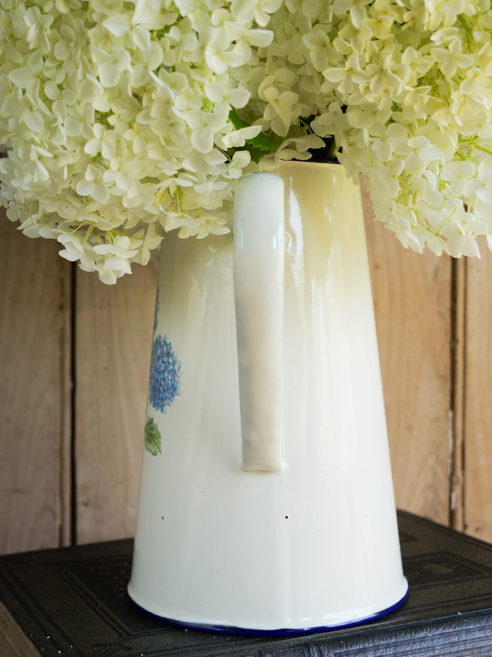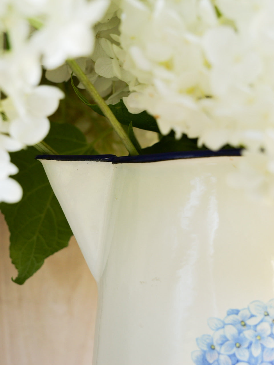 A pretty cream enamel jug with contrasting blue trim and an image of hydrangeas to the front.