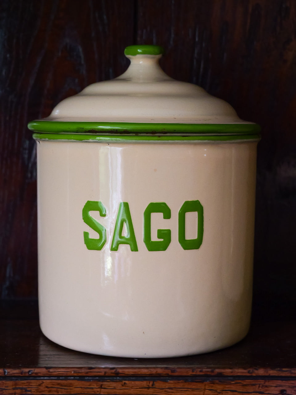 Vintage enamel storage container from the 1940s. Cream in colour with contrasting green lettering and trim.