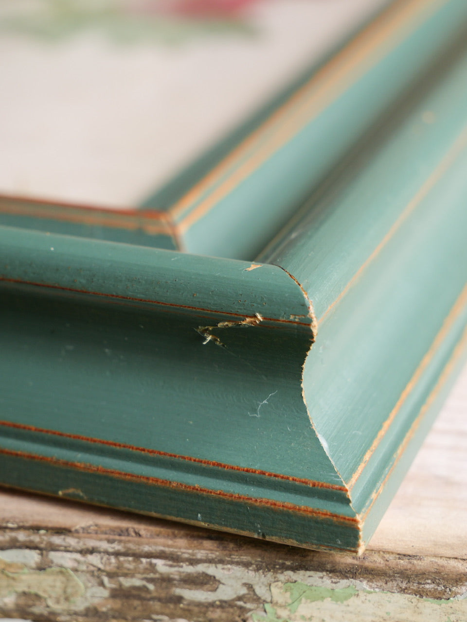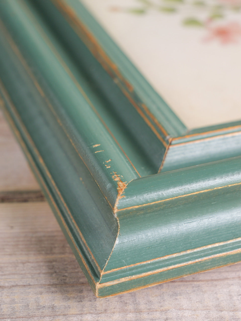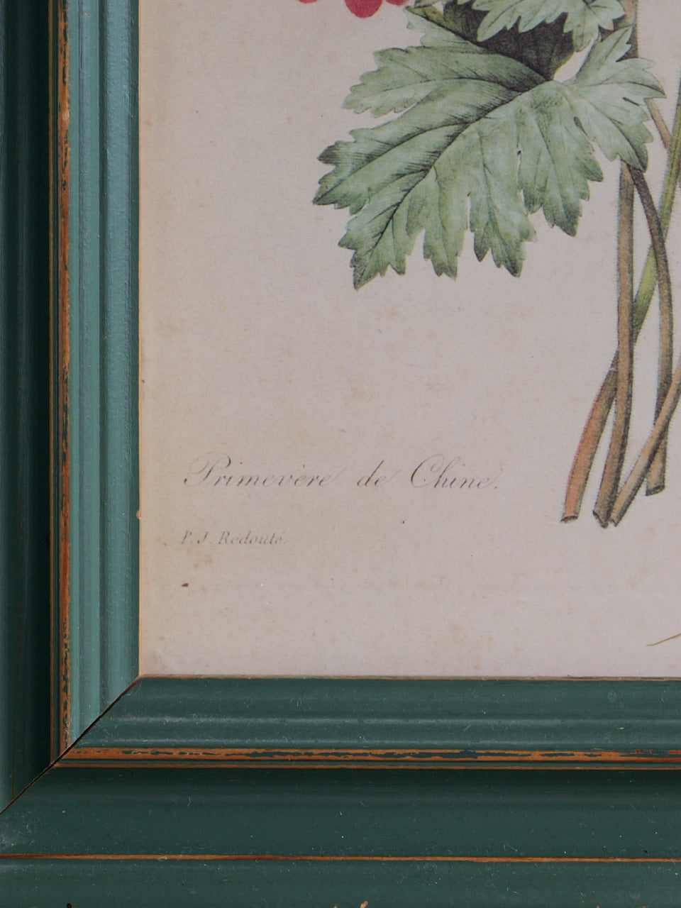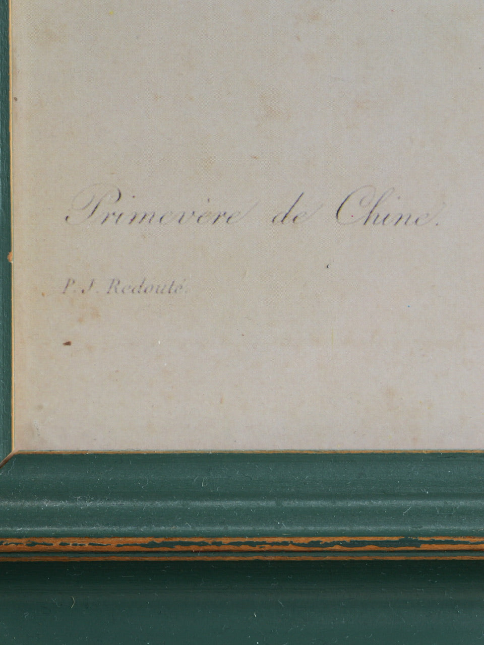 A very pretty old floral print by PJ Redoute in original painted green frame with gold accents. Glazed. Ready to hang.