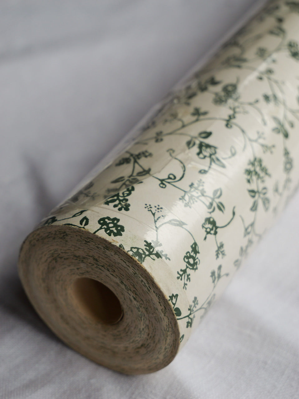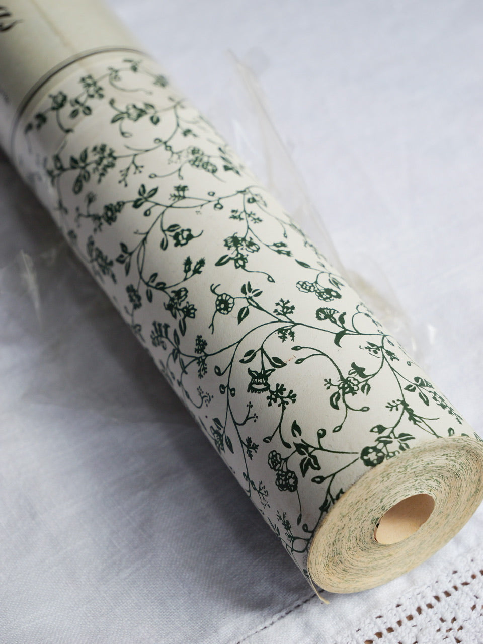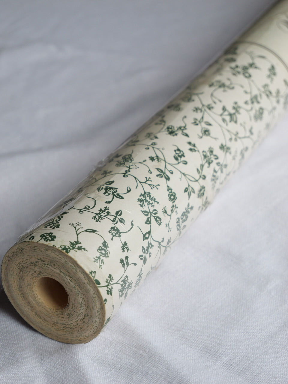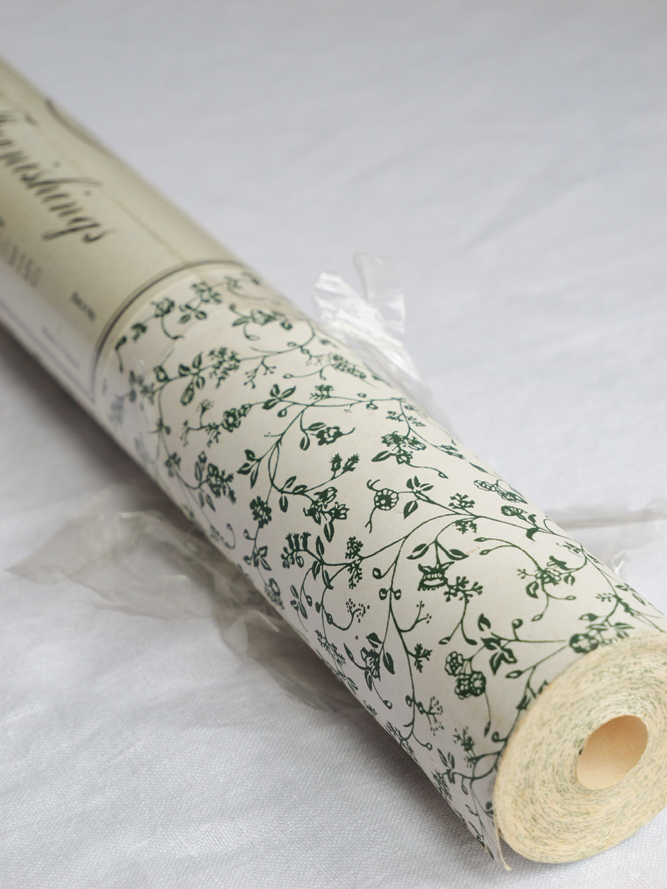 A very pretty 10 metre roll of vintage Laura Ashley wallpaper in the much-loved ‘Wild Clematis’ pattern. Green floral ditsy print on a cream background. 53cm wide. Partially in original cellophane wrap. Some light wear and discolouration to the exposed paper, as per photographs.