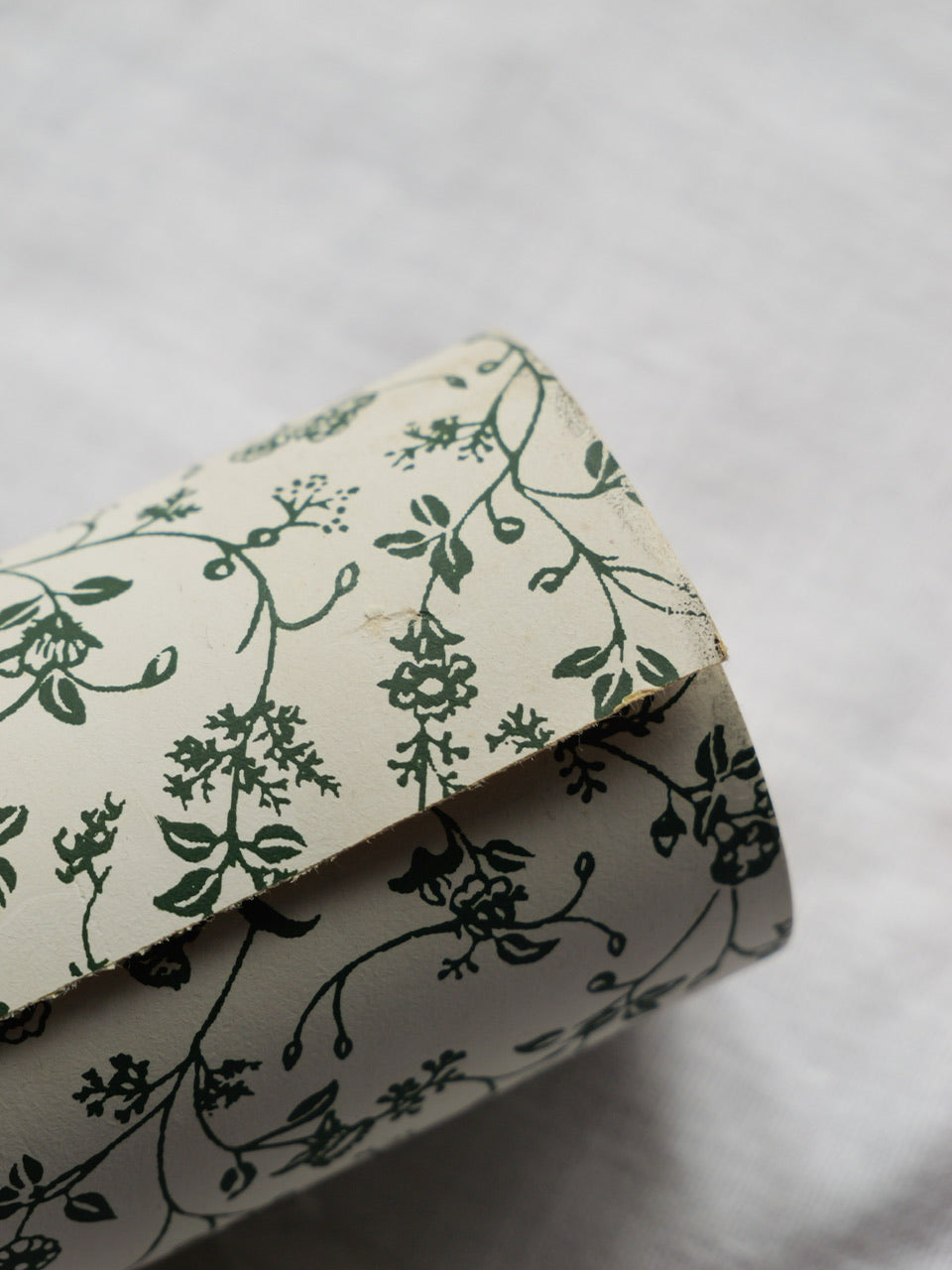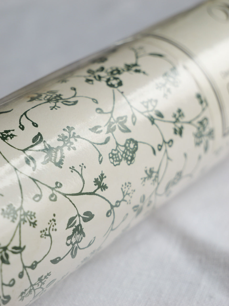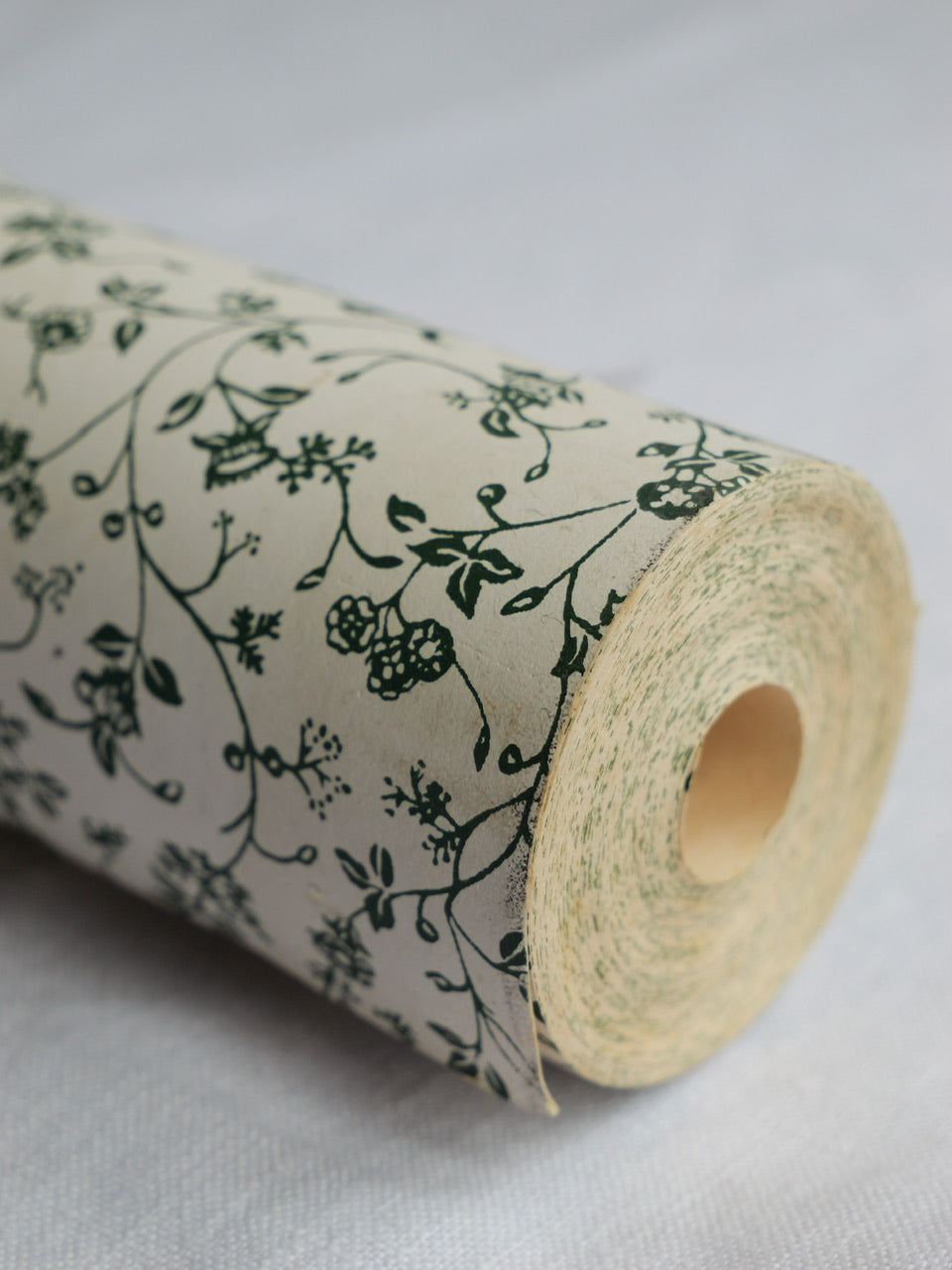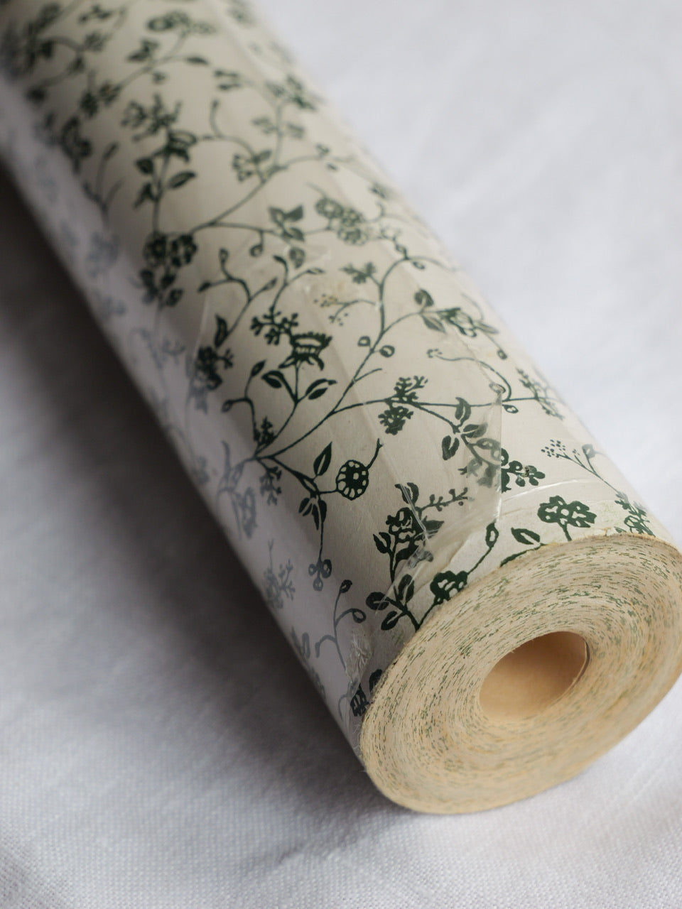 A very pretty 10 metre roll of vintage Laura Ashley wallpaper in the much-loved ‘Wild Clematis’ pattern. Green floral ditsy print on a cream background. 53cm wide. Partially in original cellophane wrap. Some light wear and discolouration to the exposed paper, as per photographs.