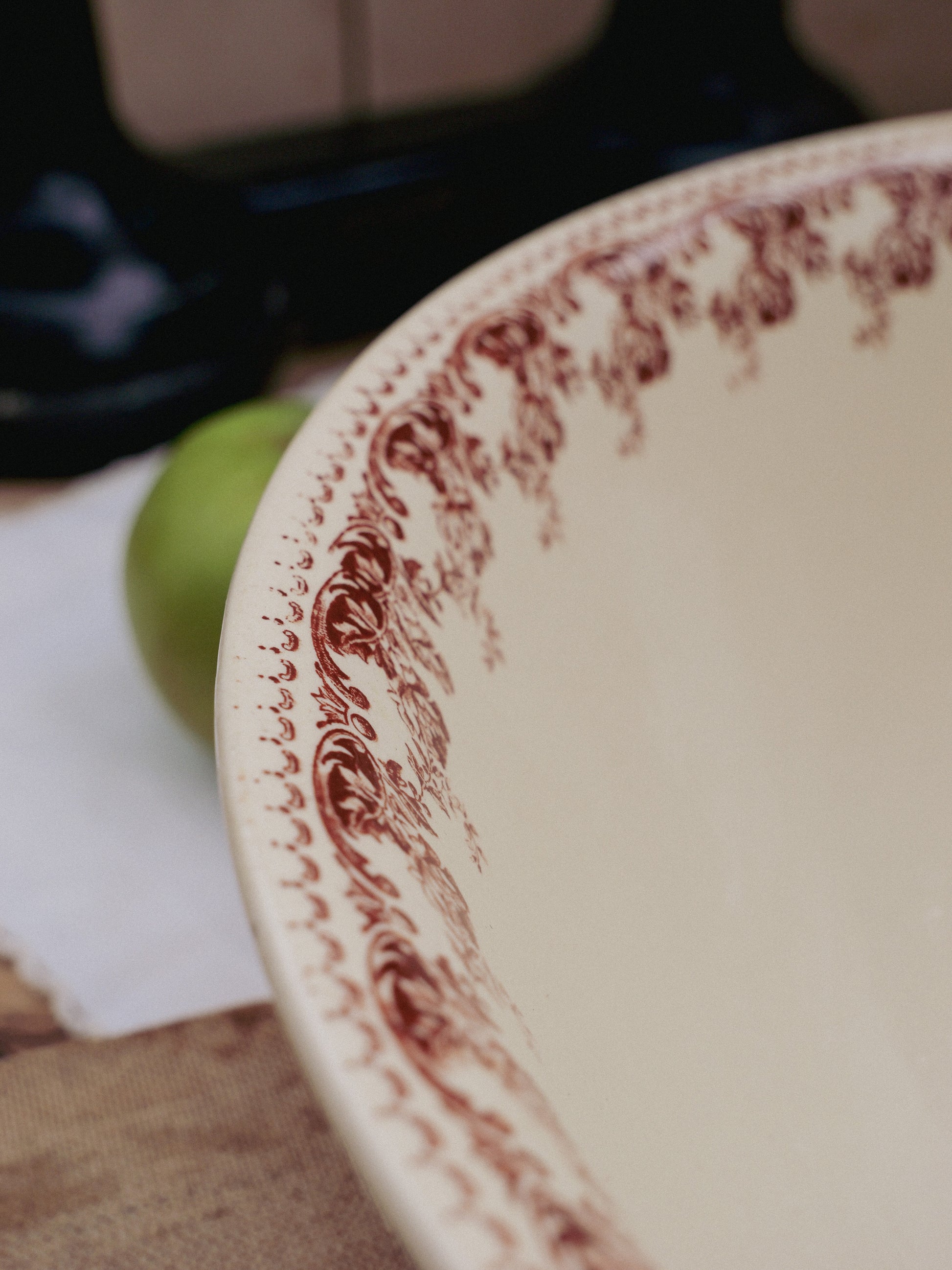 Beautiful old cream transferware bowl with a band of floral detail around the outside in a lovely rusty tone. The same pattern repeats around the rim. A lovely warm neutral piece to compliment wood or stone. The perfect fruit bowl!